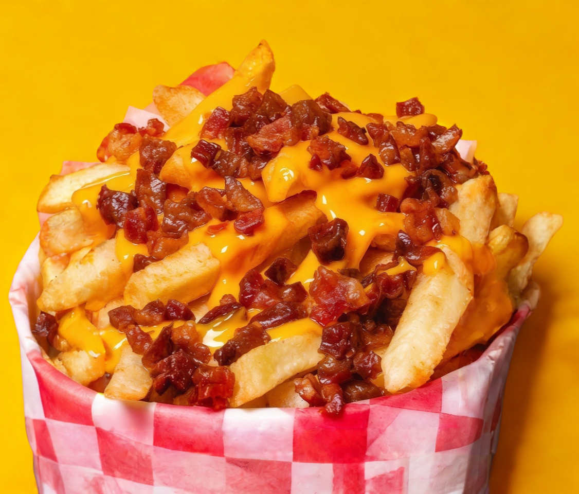 250gr de boneles en una cama de papas con queso amarillo y tocino deshidratado , aderezo ranch y salsa de su elección