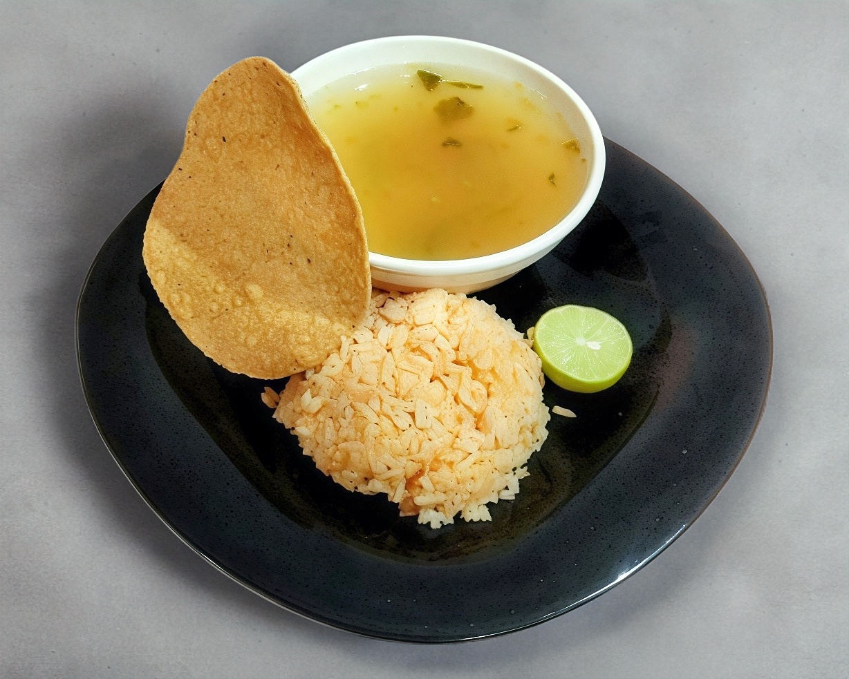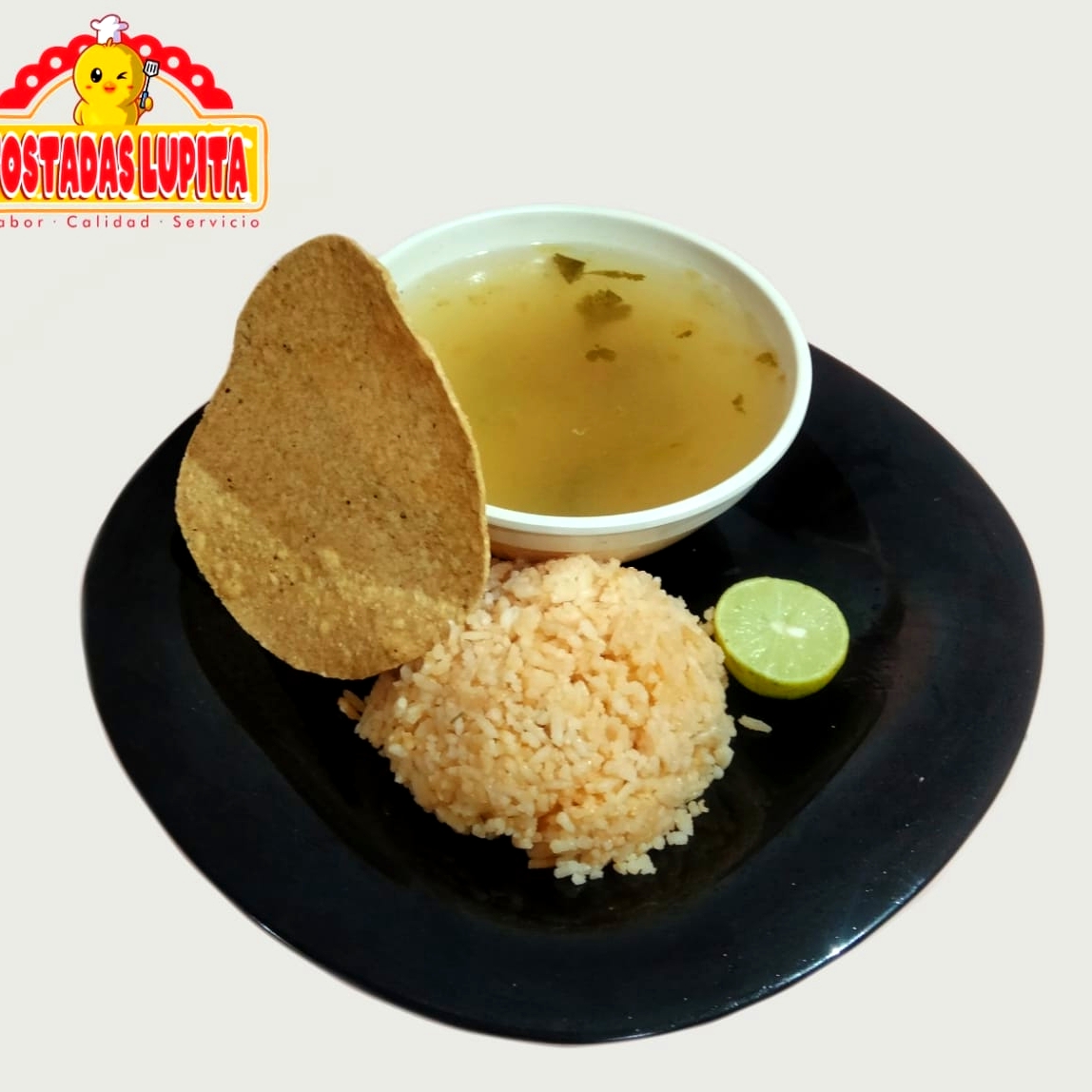Consomé de pollo calientito, incluye arroz, verdura, limón y una tostadita.