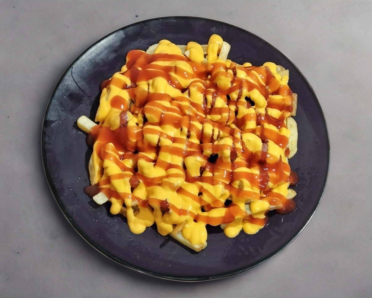 Papas a la francesa con salchicha frita en ruedas, bañadas en queso amarillo caliente y salsa catsup.