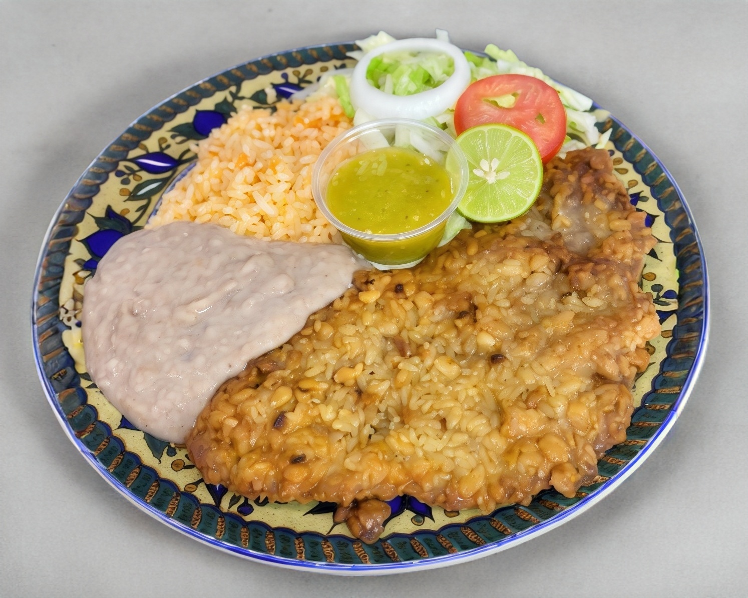 Milanesa de res acompañada de arroz y frijoles refritos Incluye 5 tortillas de maíz, salsa y limón.
