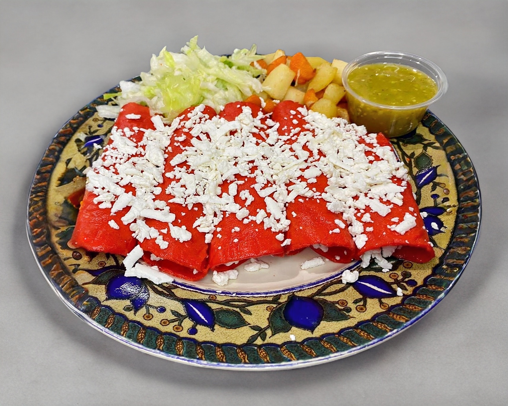 Orden con 5 piezas de crujientes flautas, acompañadas de guacamole,crema,salsa(todo aparte) ,lechuga y arroz