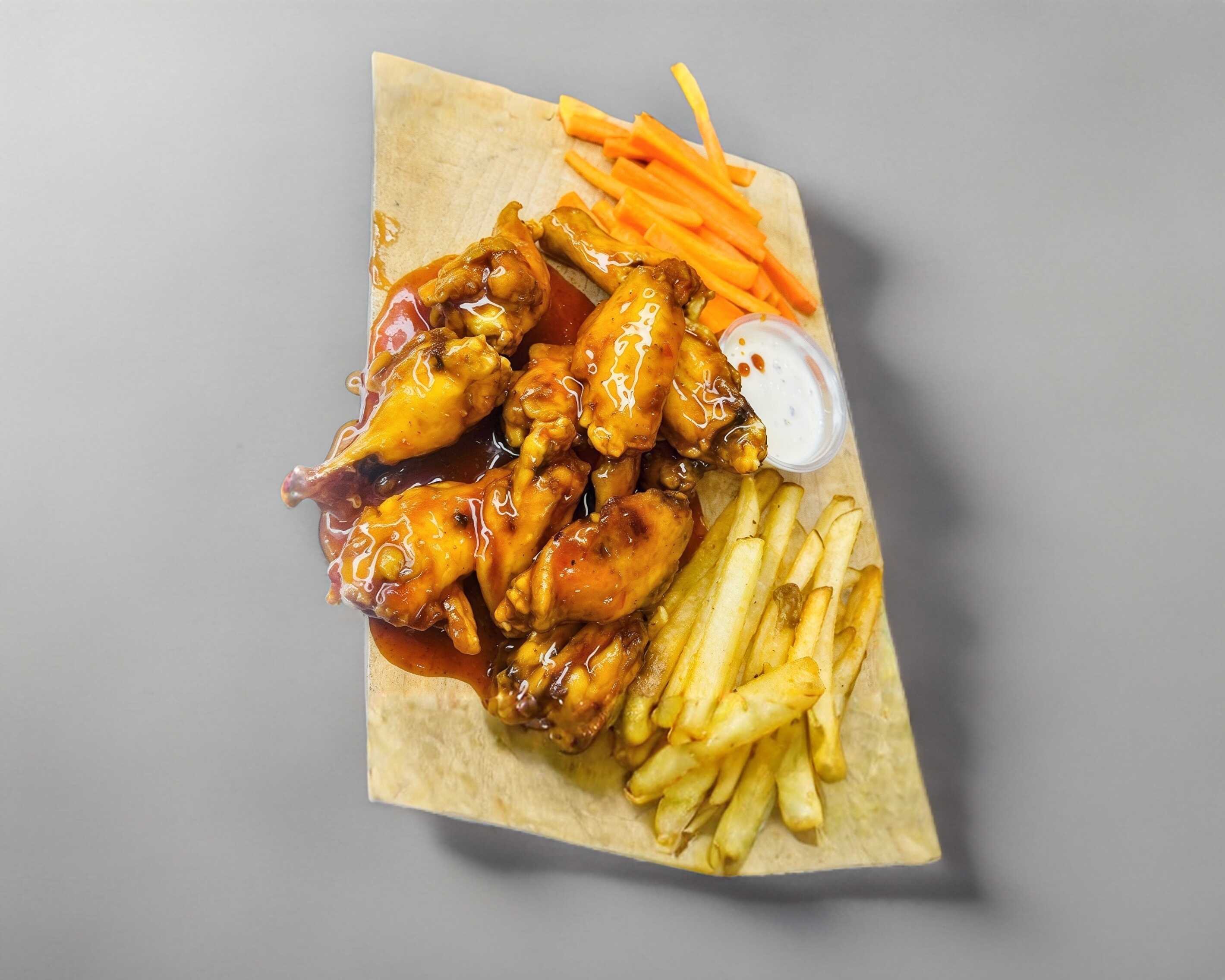350 Gramos (10-12) de deliciosas alitas acompañadas de papas a la francesa y verduras, bañadas en tu salsa favorita, incluye aderezo ranch.
