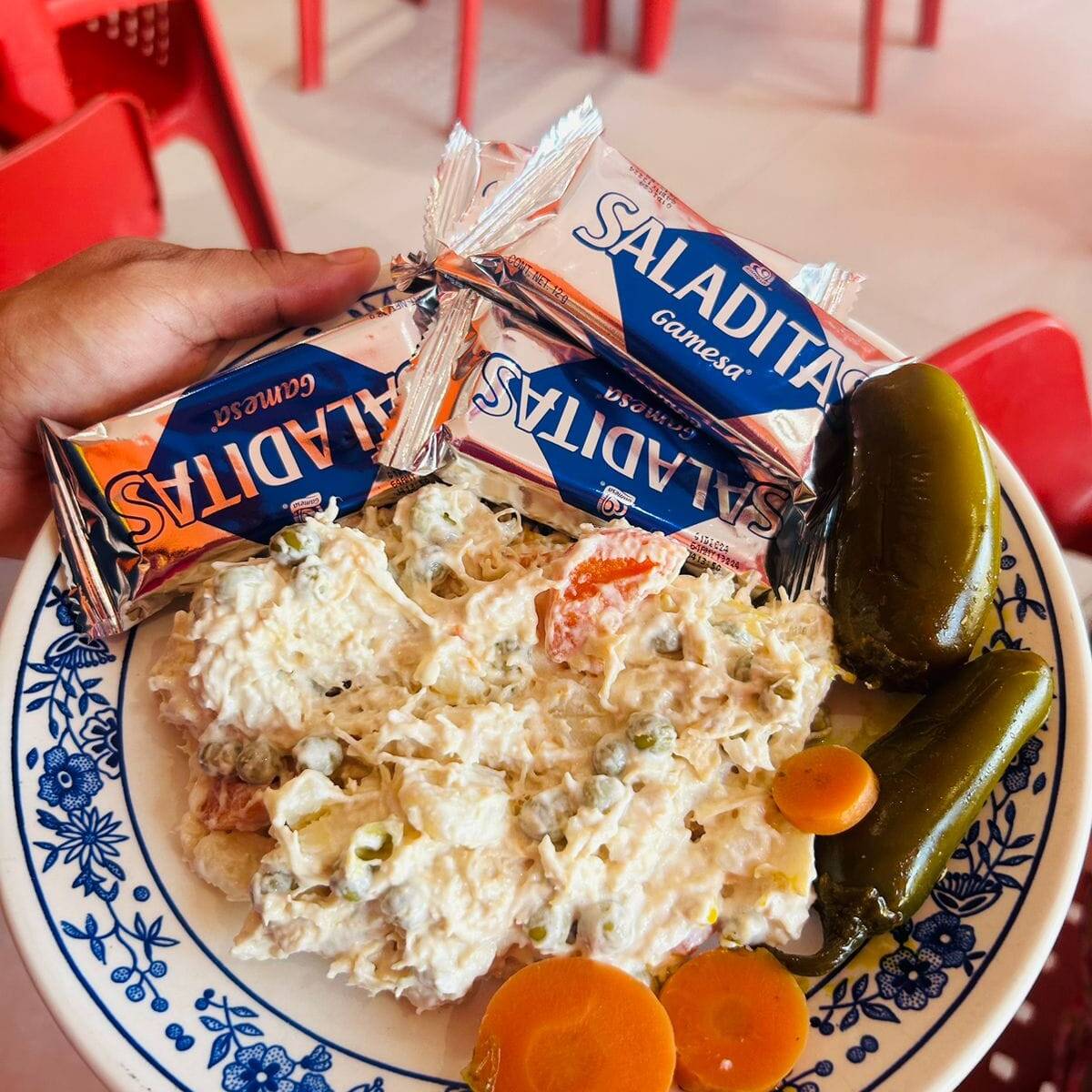 Porción con 450 gramos (papa,zanahoria,chicharos,mayonesa y pechuga de pollo)incluye galletas y jalapeños.