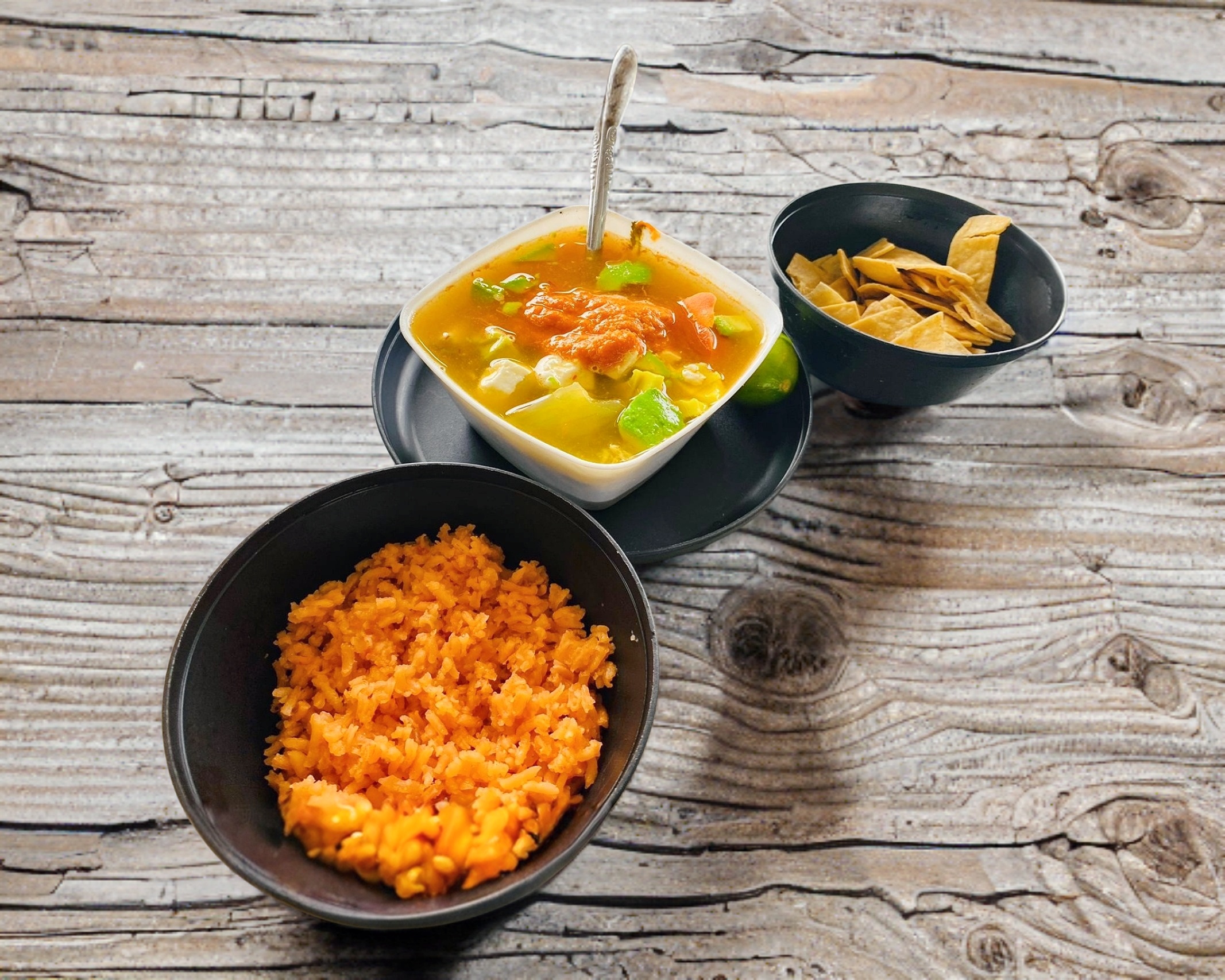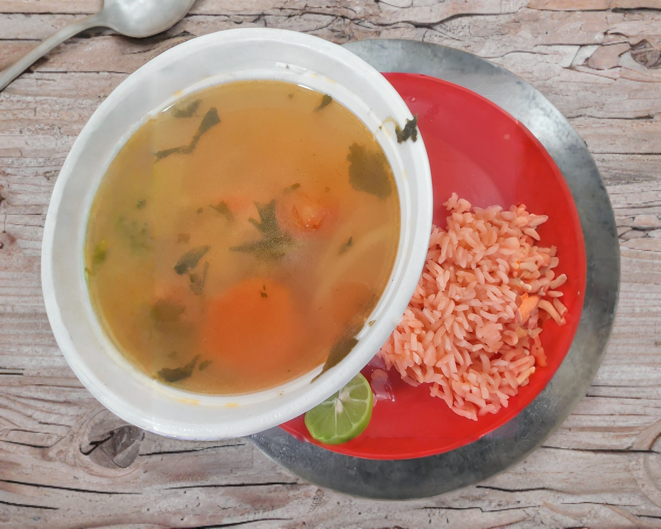 1 lto consomé con pechuga desmenuzada, arroz, verduras y su respectivo limon.