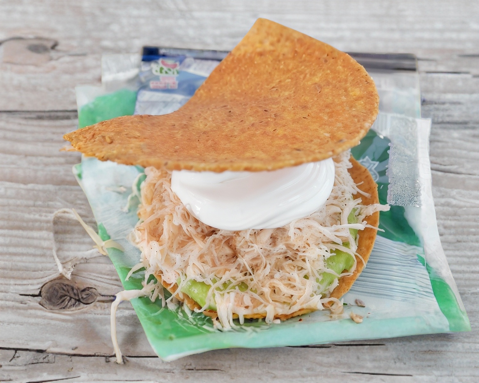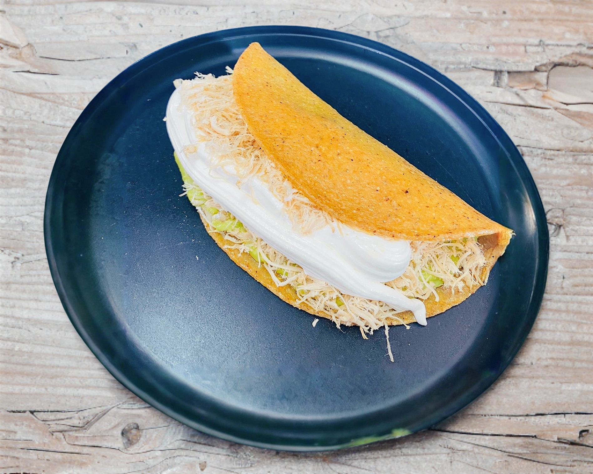 Tortilla grande suavecita, con una capa de aguacate, pollo desmenuzado y crema.