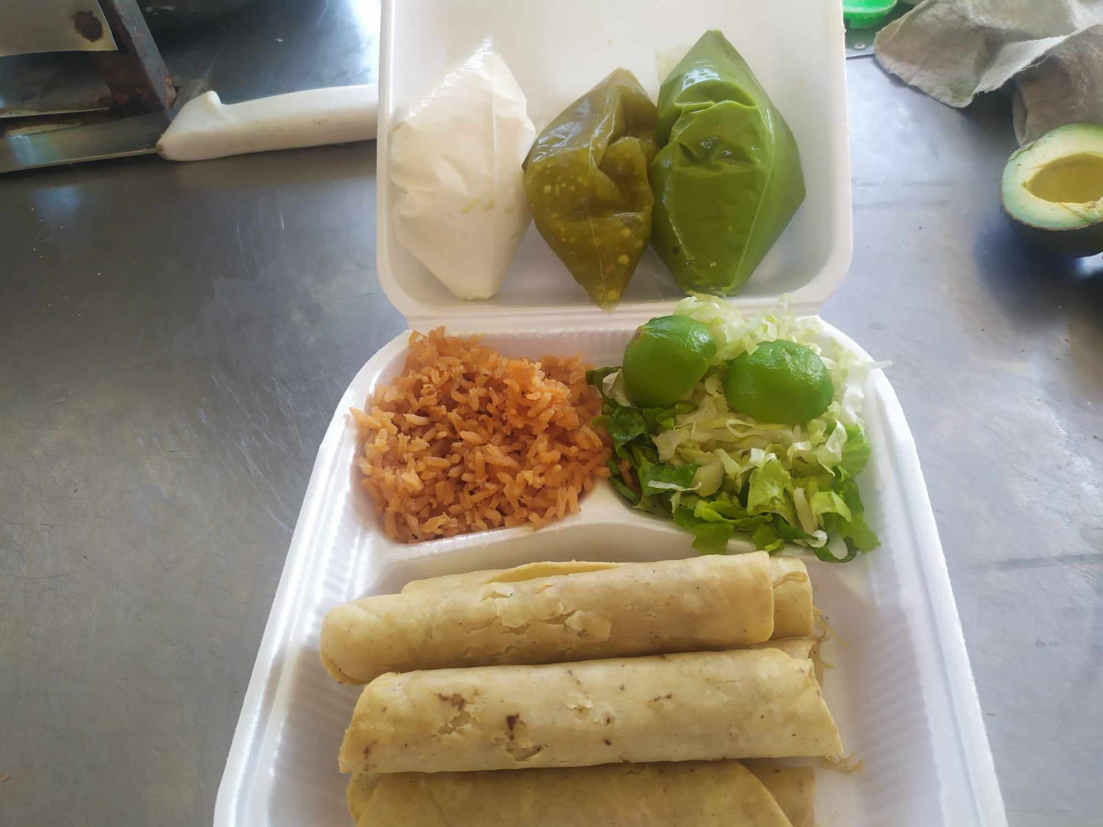 orden de 5 flautas, incluye guacamole,crema, lechuga y salsa.