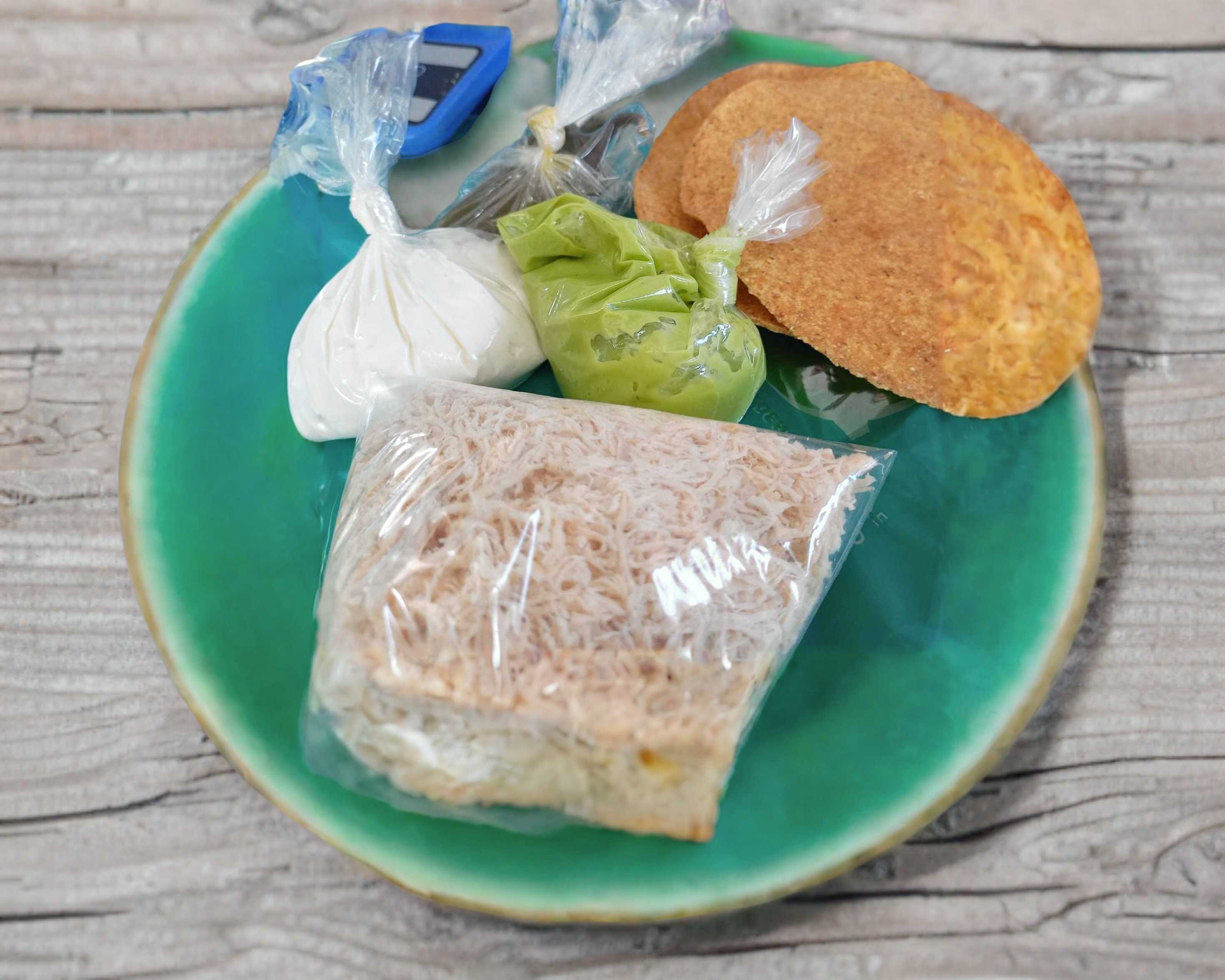 Viene con los ingredientes separados, bolsita 120 gm de pollo, 100gm de crema chilchota, 120 gm de aguacte, 2 tapas de tostada, y su respectivo jalapeño