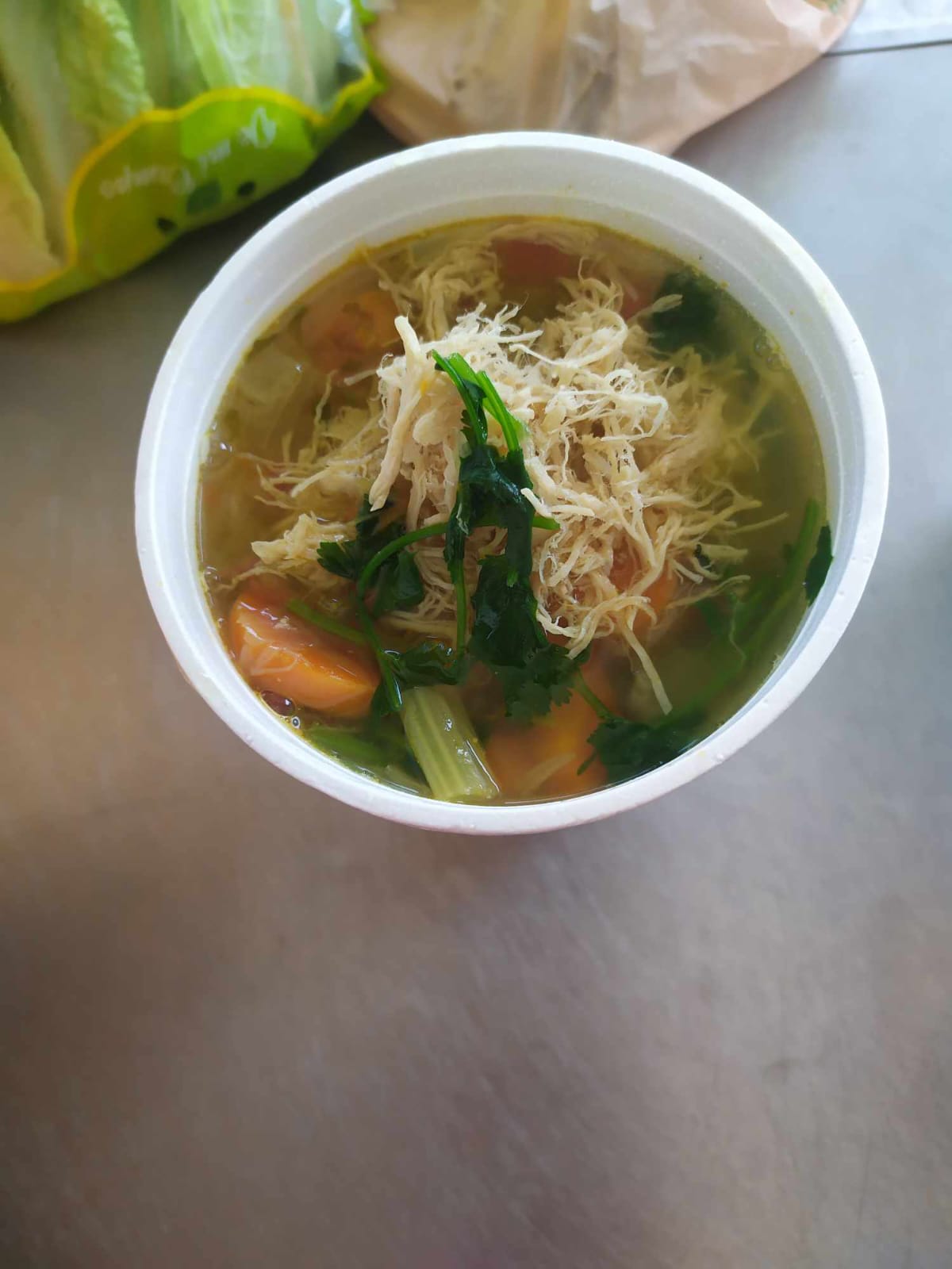 1/2lt. De consome, contiene pechuga desmenuzada, arroz,apio,zanahoria,cilantro,tomate y su respectivo limon.