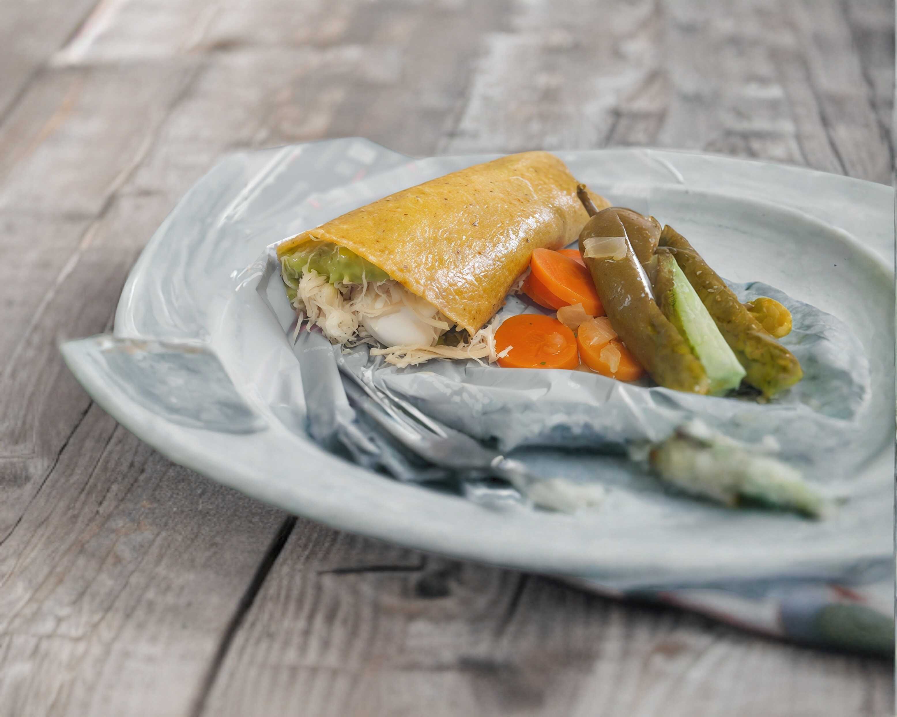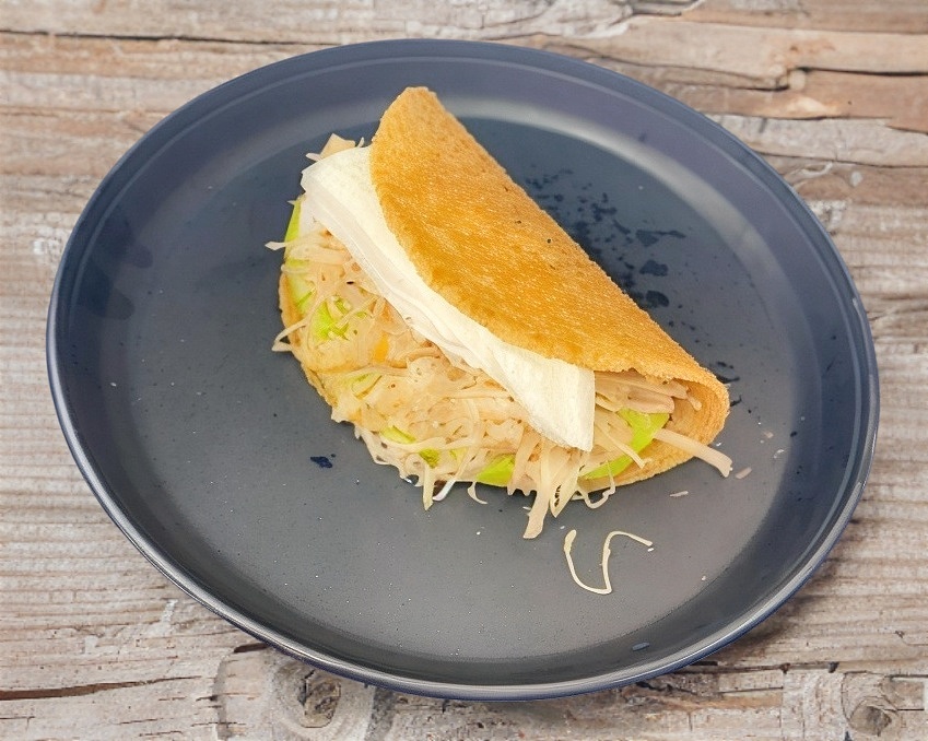 Tortilla chica, suave,acompañada de pollo,aguacate y crema chilchota.