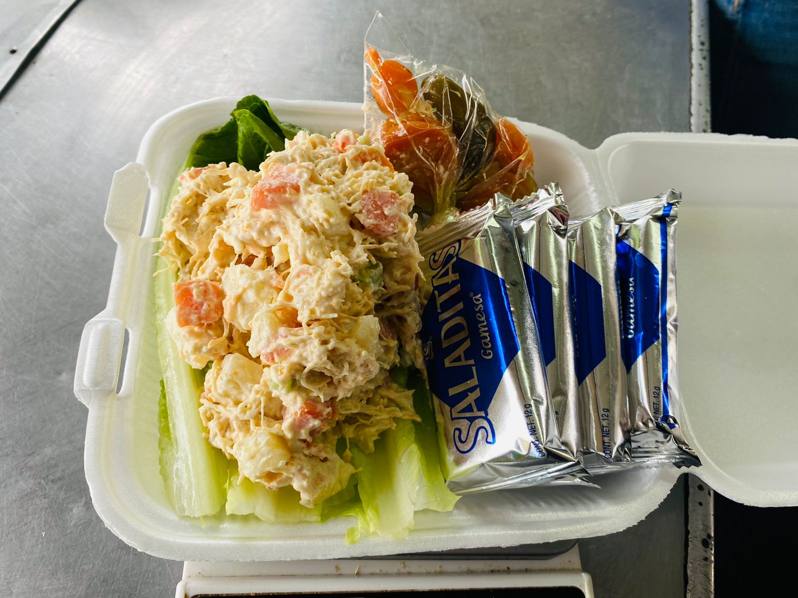 Deliciosa ensalada de pechuga de pollo, apio, zanahoria, papa, galleta salada y su respectivo chile jalapeño