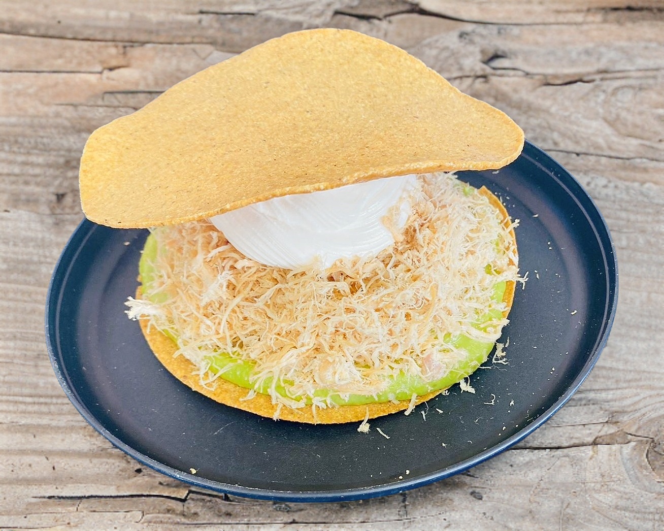 Tostada con pechuga desmenuzada, crema chilchota y delicioso aguacate