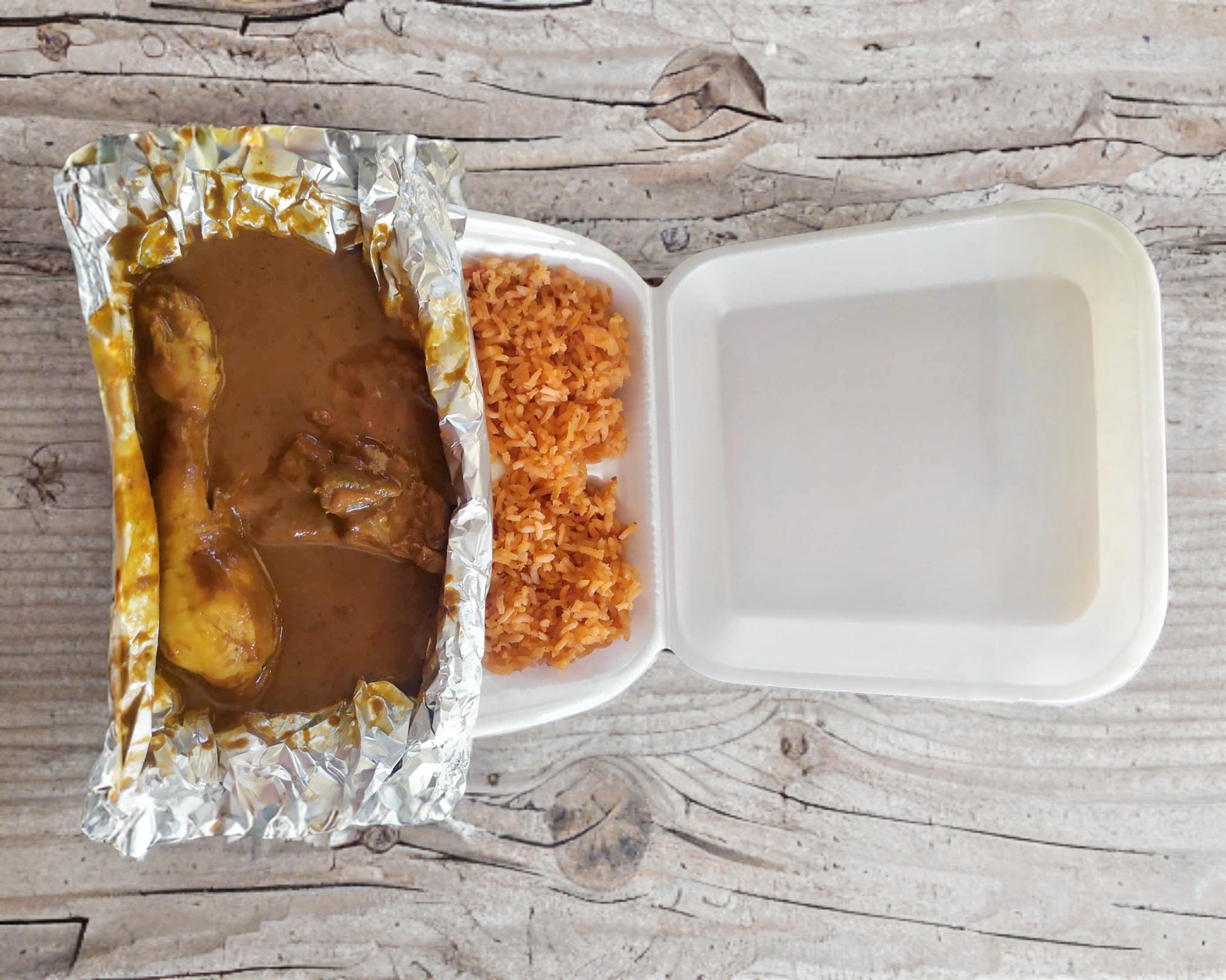 Pierna y muslo de pollo, con mole , arroz y tortillas.