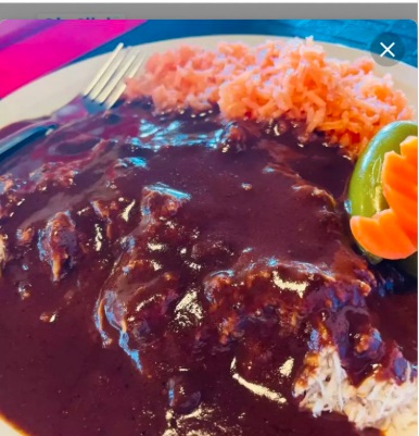 Pechuga de pollo, con mole, incluye arroz y tortillas, no incluye frijoles