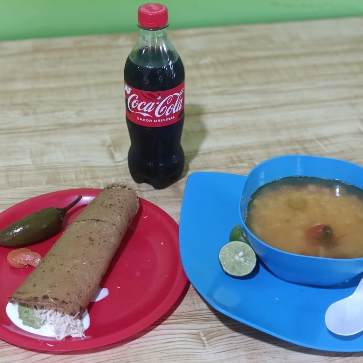 Delicioso taco de pechuga, 1/2 consome con arroz y refresco (400 ml)
