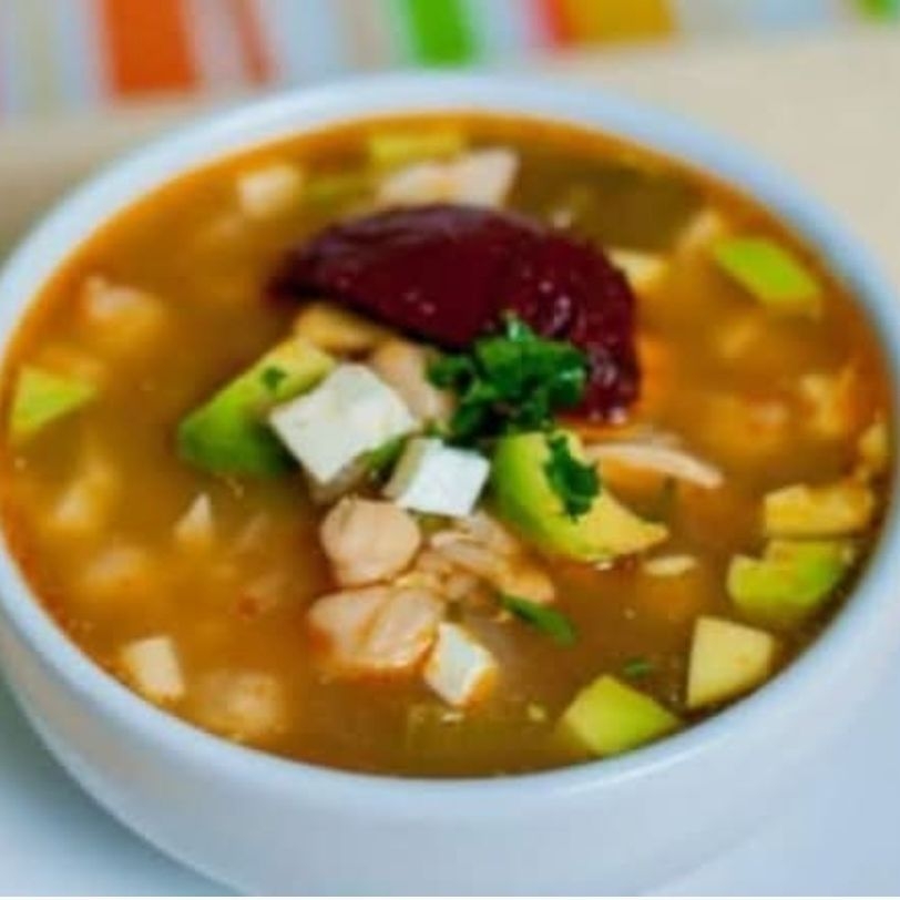 Delicioso consomeo de pollo con arroz, aguacate, queso, chipotle.