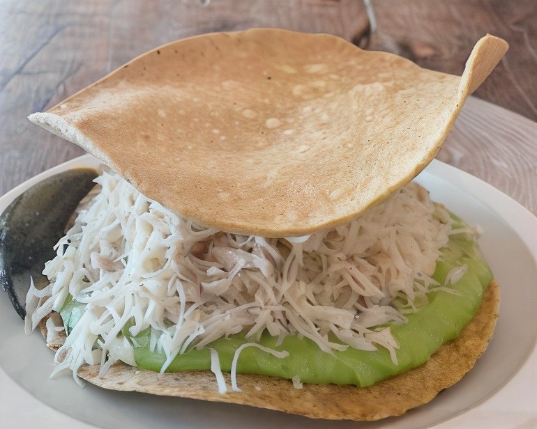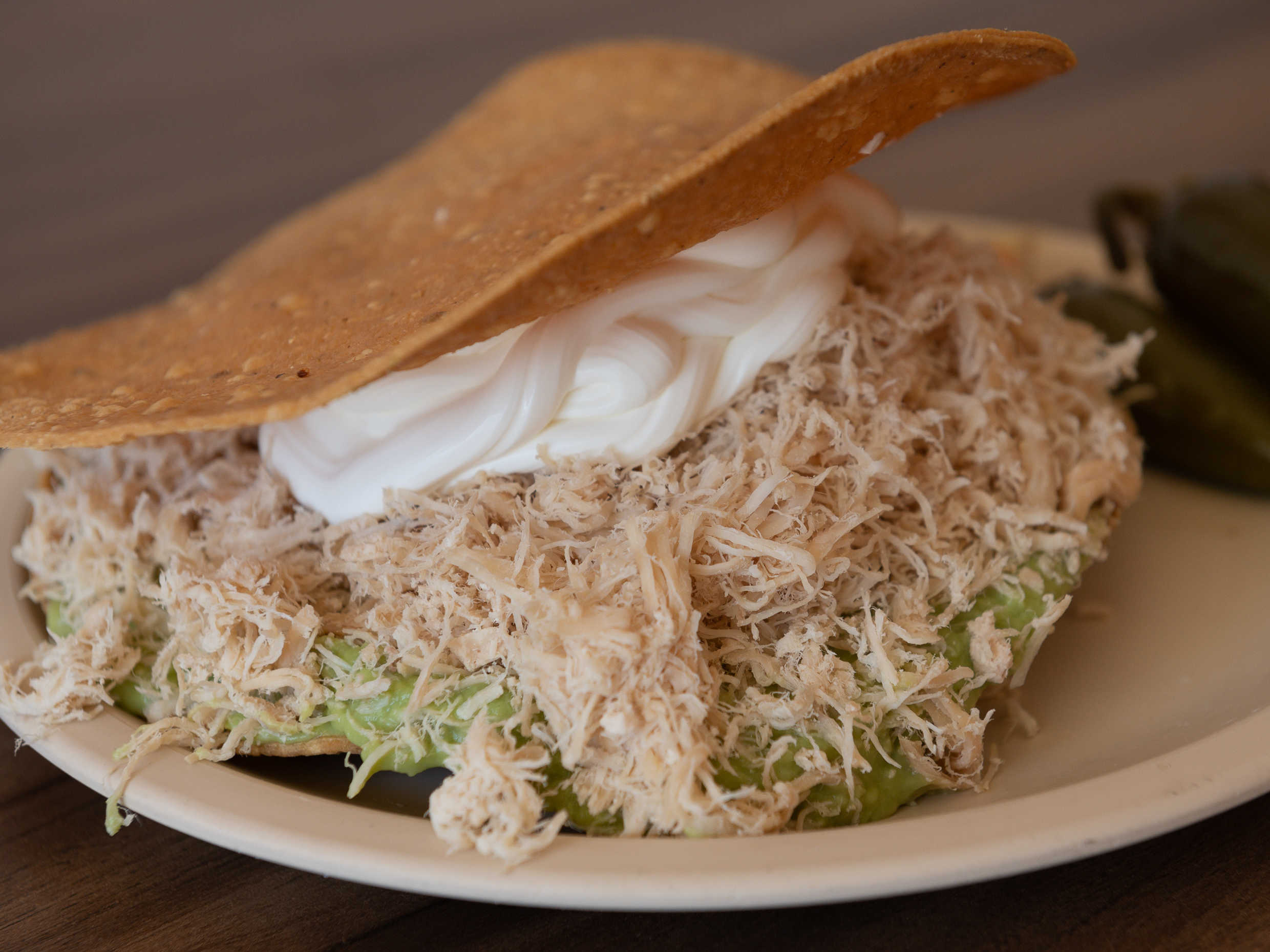 1 tostada especial, para una persona 100% pechuga, guacamole y crema. Incluye chile jalapeño.