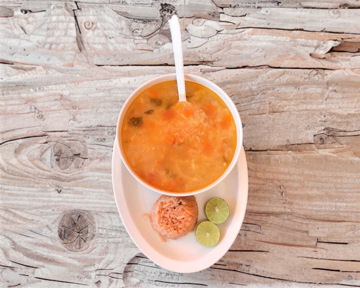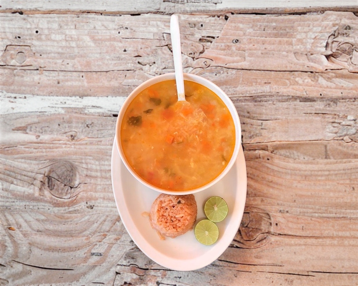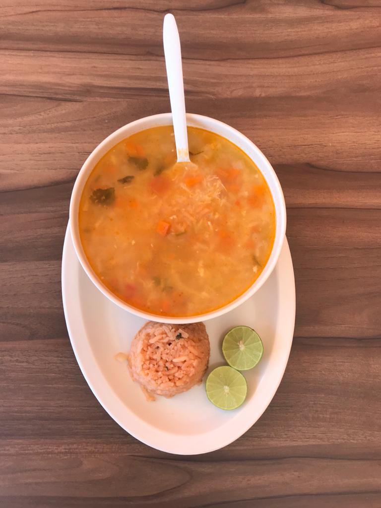 1 litro de nuestro delicioso caldo acompañado con un cuarto de arroz, pechuga desmenuzada y tortillas.
