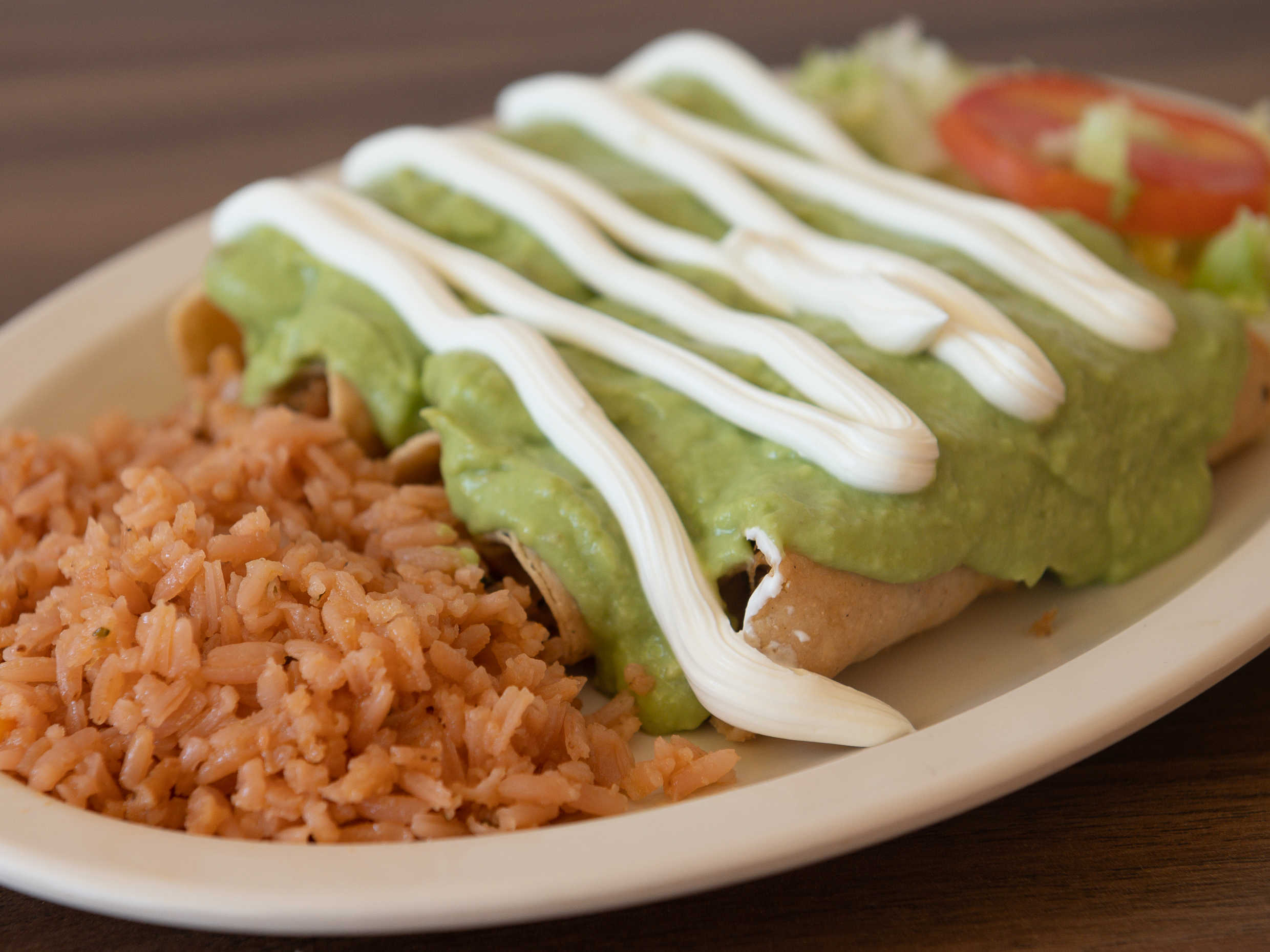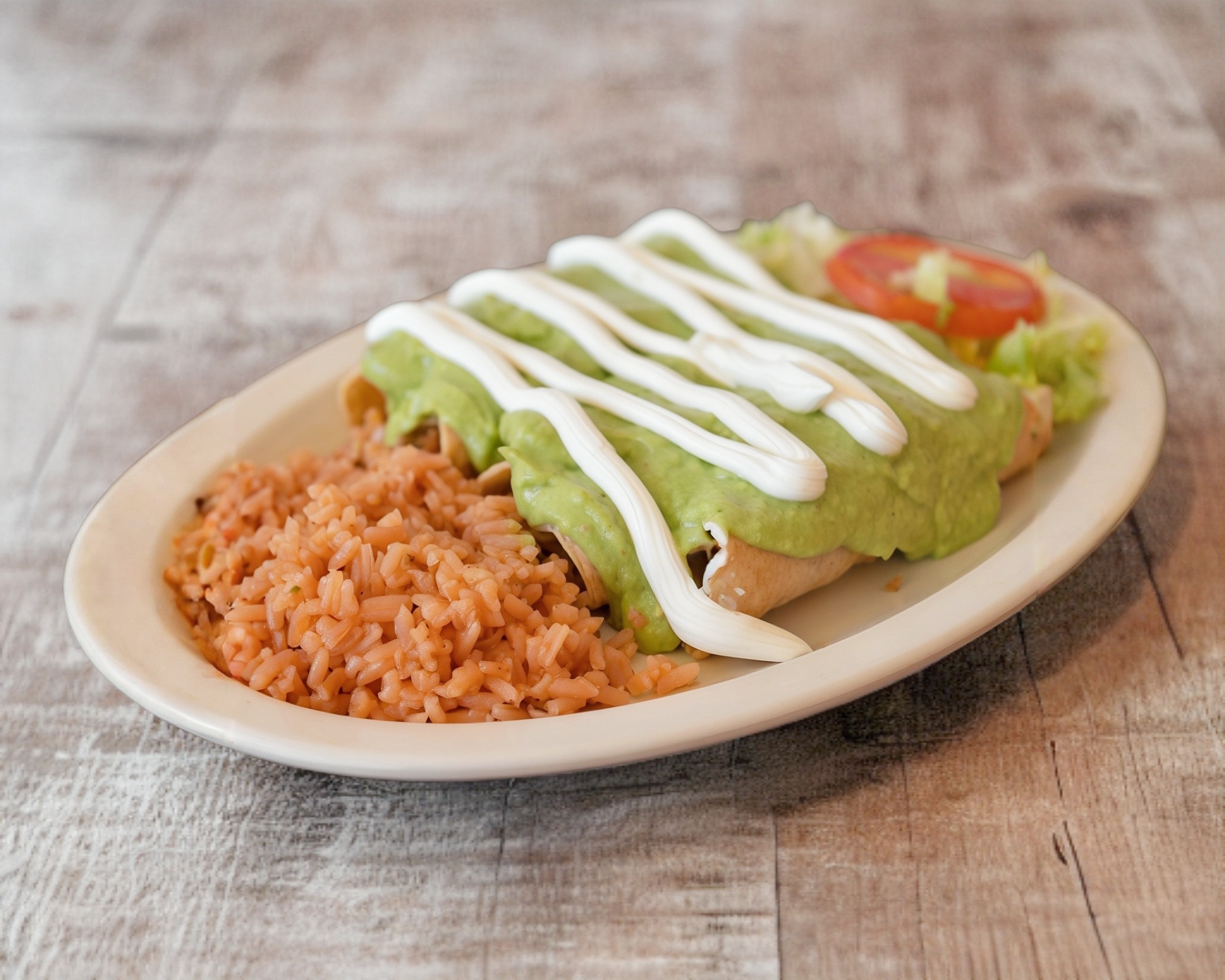 Orden con 5 piezas de flautas doraditas, porción de arroz, lechuga, tomate, sus porciones de guacamole, crema y salsa.