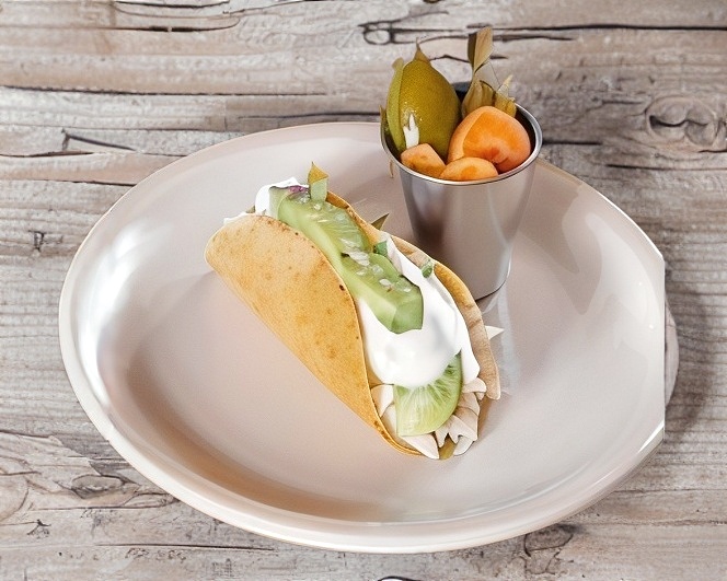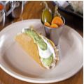 Taco en tamaño infantil con guacamole, crema y pechuga desmenuzada.
