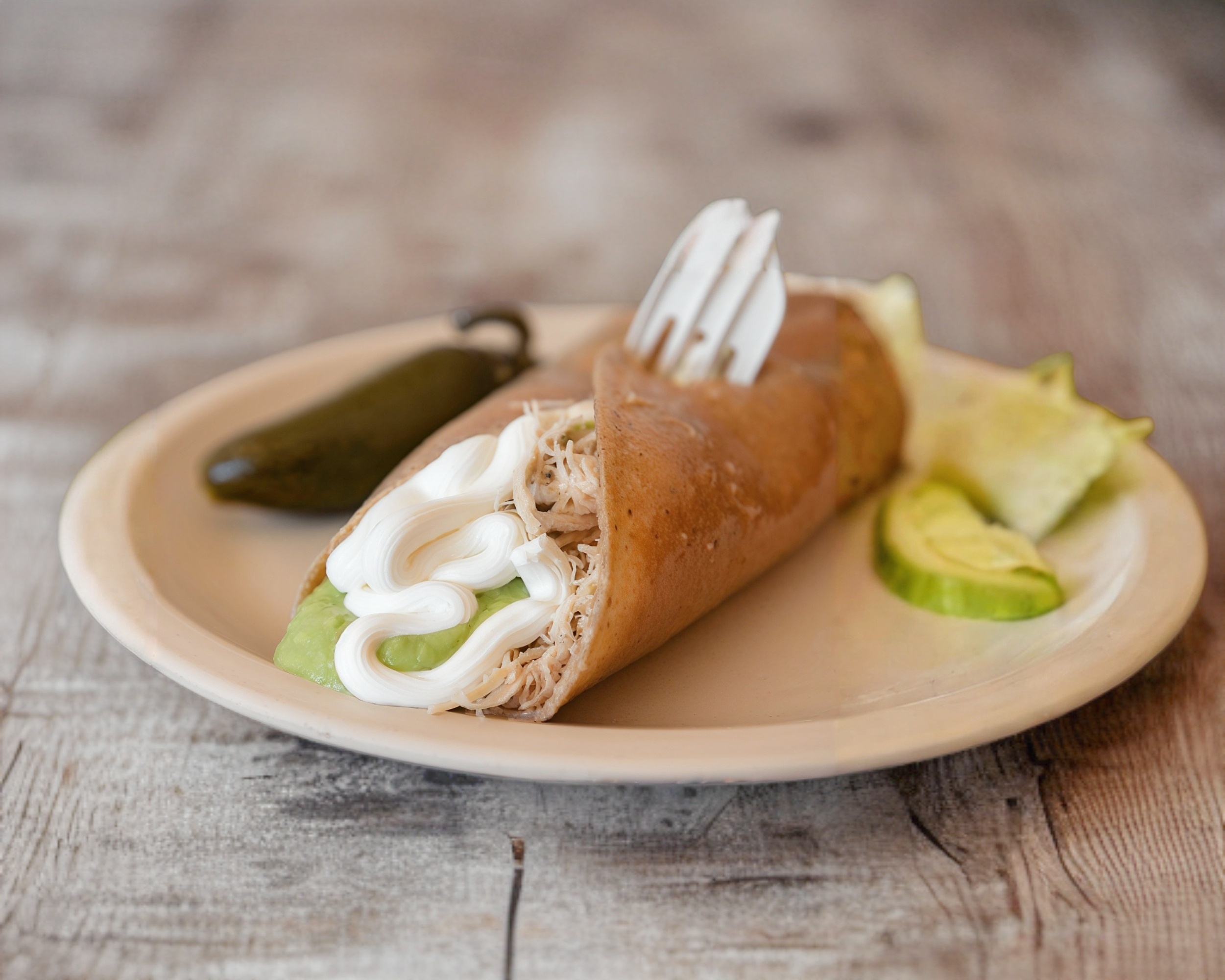 Tortilla de 20 cm. con guacamole, crema y pechuga de pollo desmenuzada.