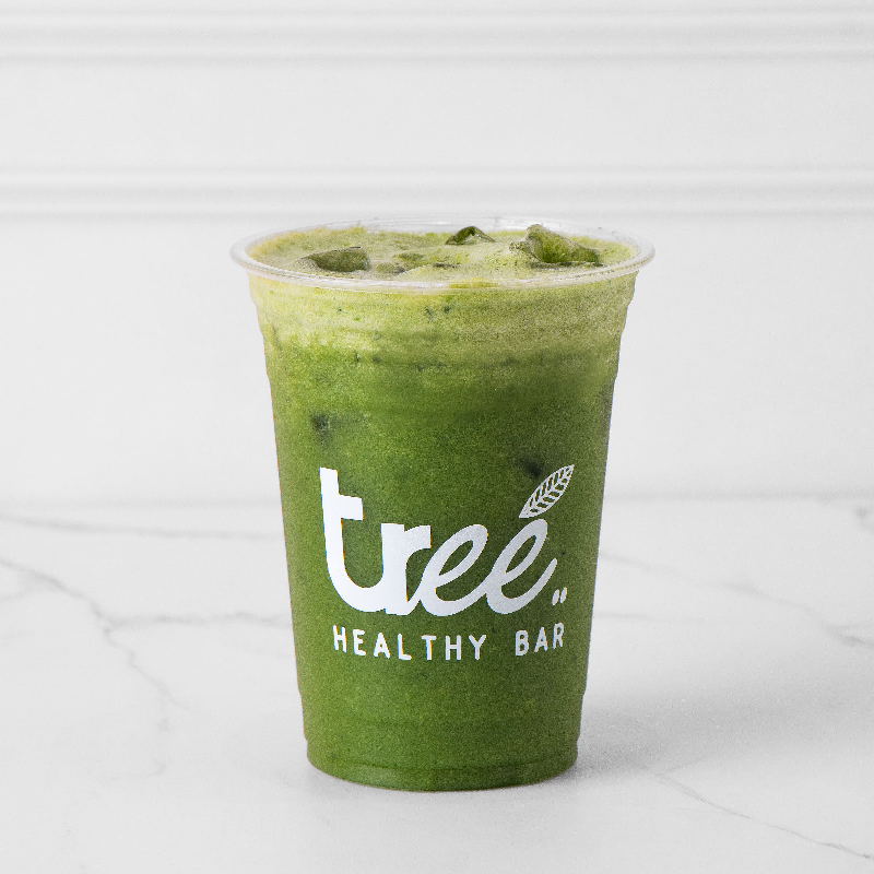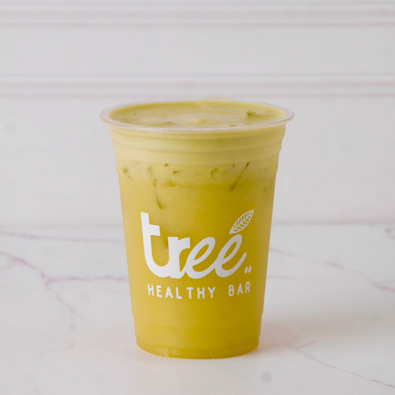 Mango, yogurt griego, matcha, espinaca y leche de almendra.