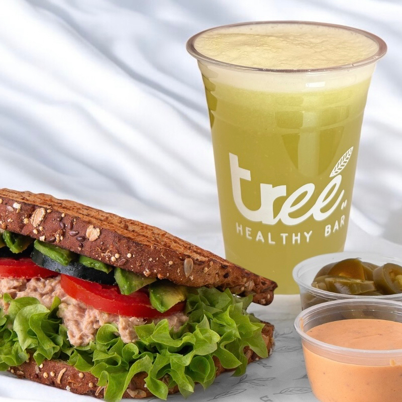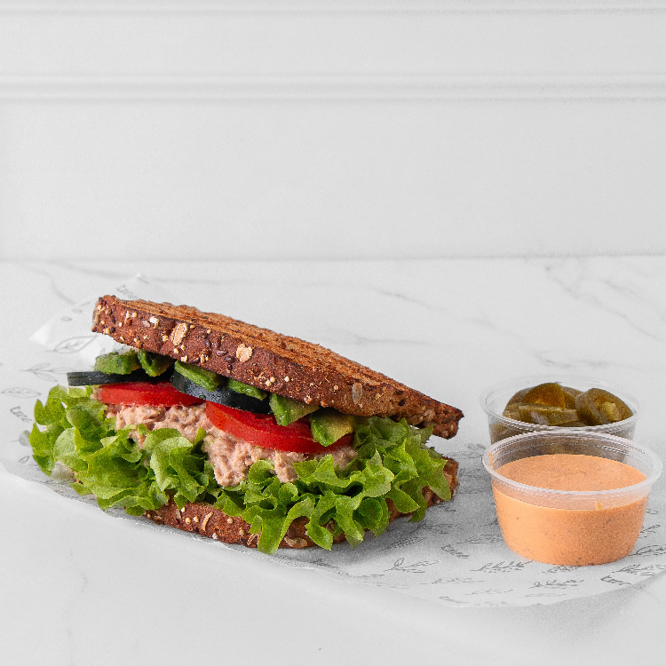 Pan orgánico, ensalada de atún, aguacate, lechuga, tomate y pepino.
