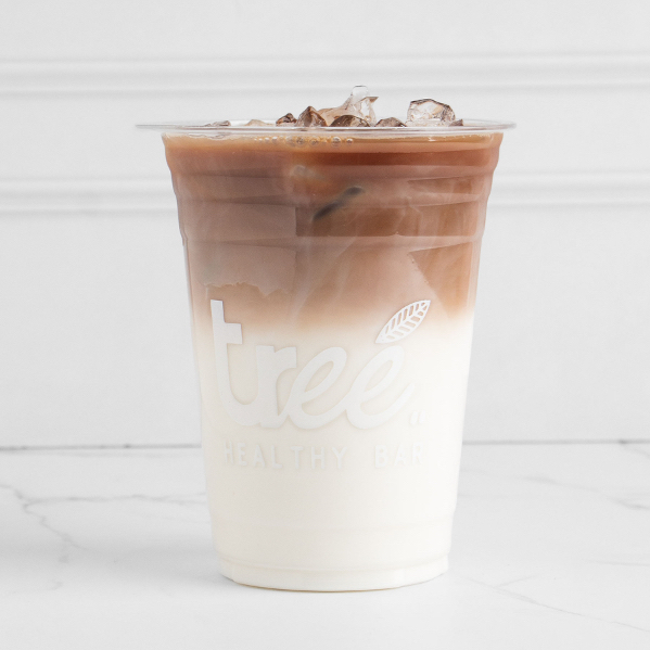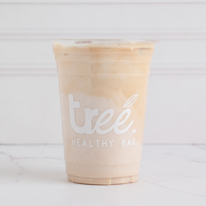 Plátano, shot espresso, cacao en polvo, dátil y leche de almendras.