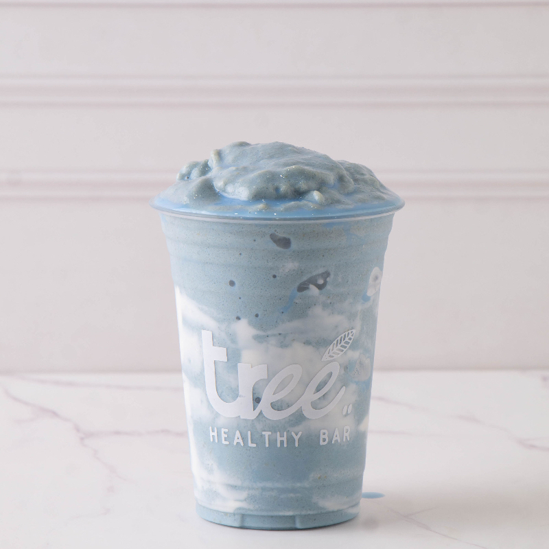 Mango, piña, espirulina azul, crema de almendra, yogurt griego y leche de coco.