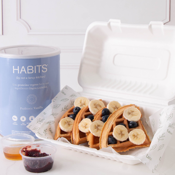 Waffles de avena, yogurt griego y leche de almendra con 15g proteína HABITS sabor vainilla. Acompañados de fruta de temporada, miel de agave y spread a elección