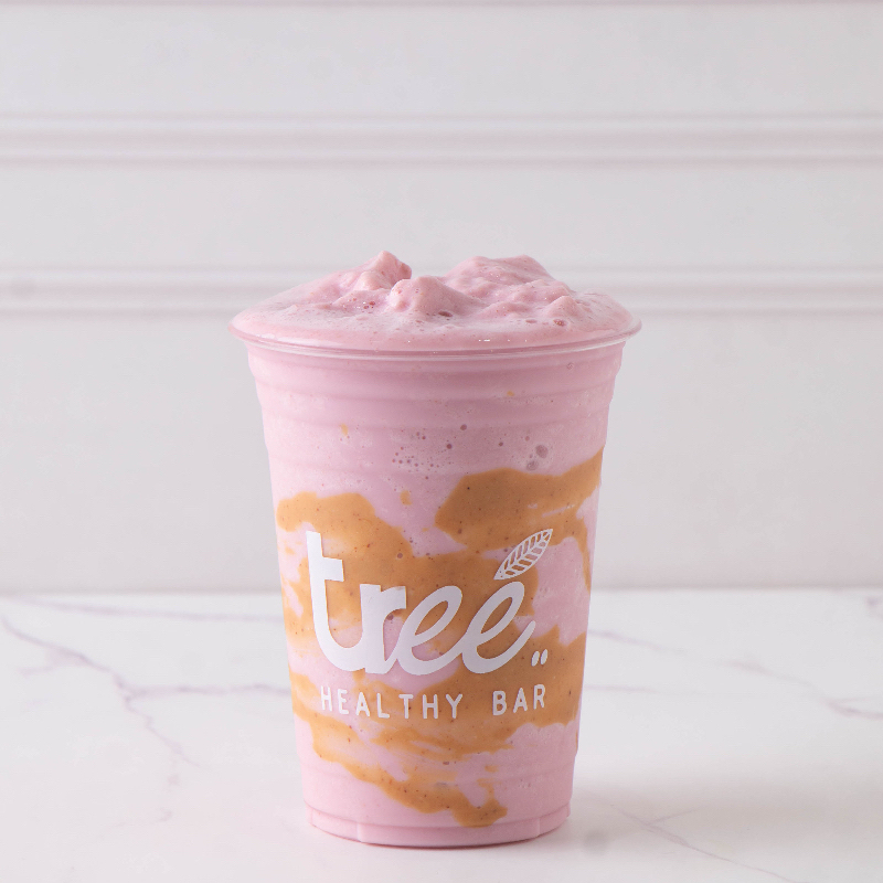 Plátano, fresa, crema de cacahuate y leche de almendras.