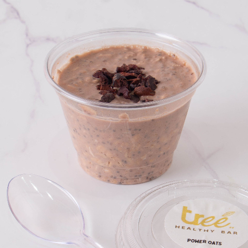 Avena, chia, yogurt griego, leche de almendras, canela, cacao y proteína HABITS sabor cacao. Con crema de cacahuate