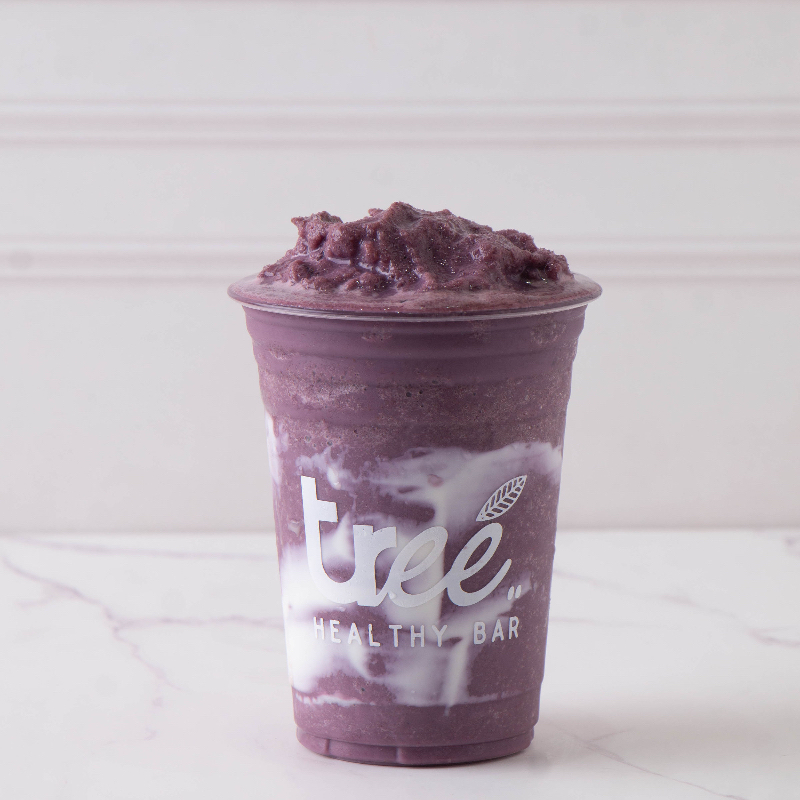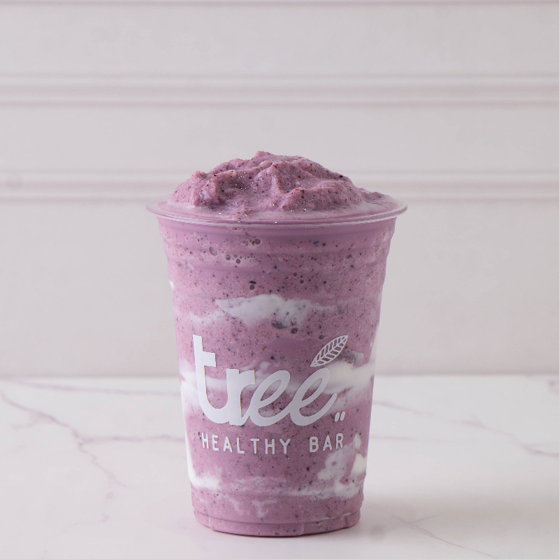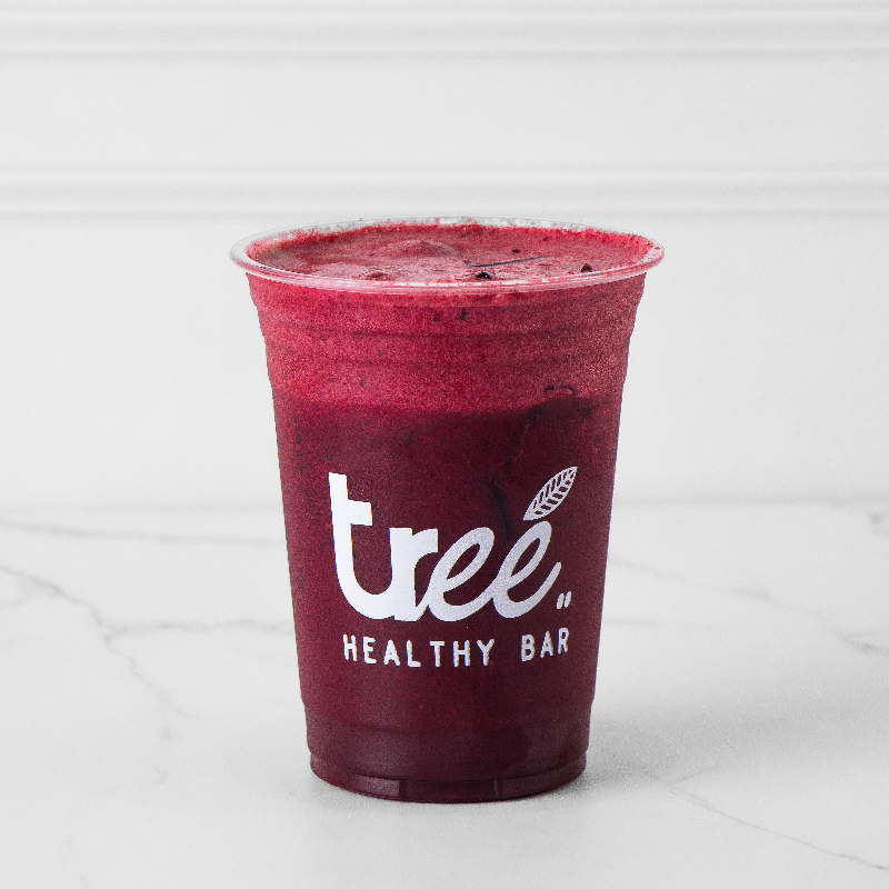 Acaí, mora azul, plátano, crema de almendras, miel de agave y leche de almendras.