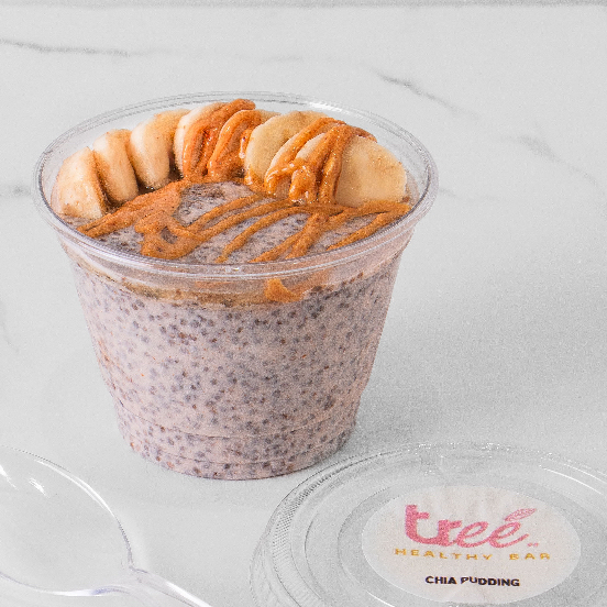Chía, yogurt griego, leche almendras, miel de agave, canela. Con fruta de temporada y crema de cacahuate.