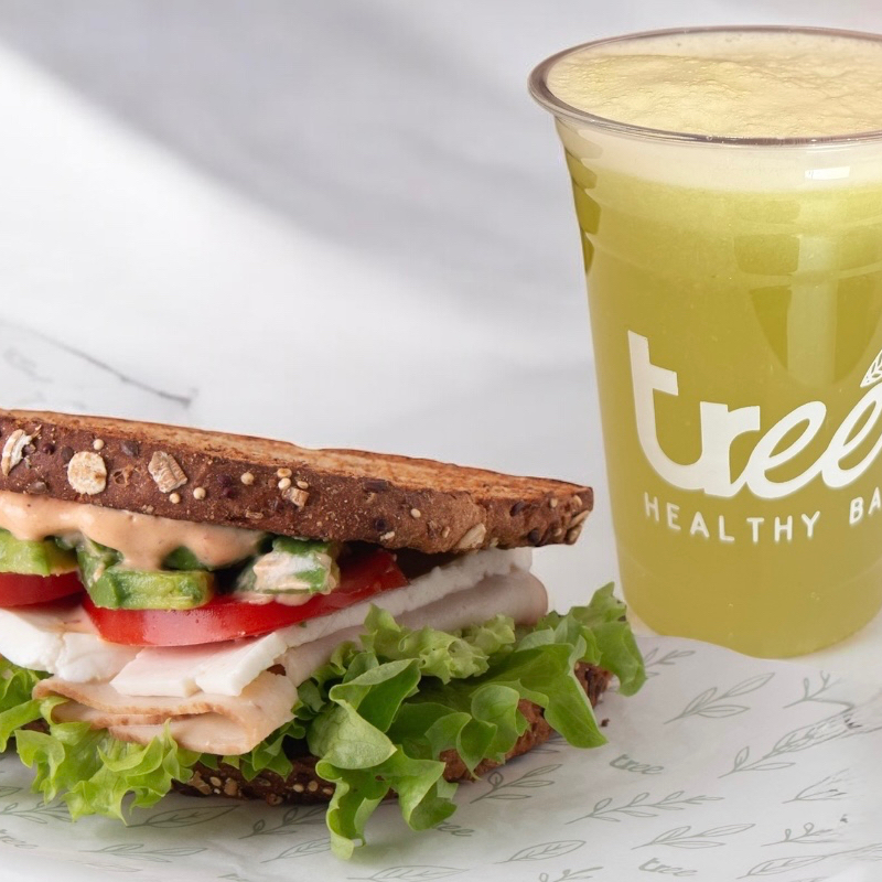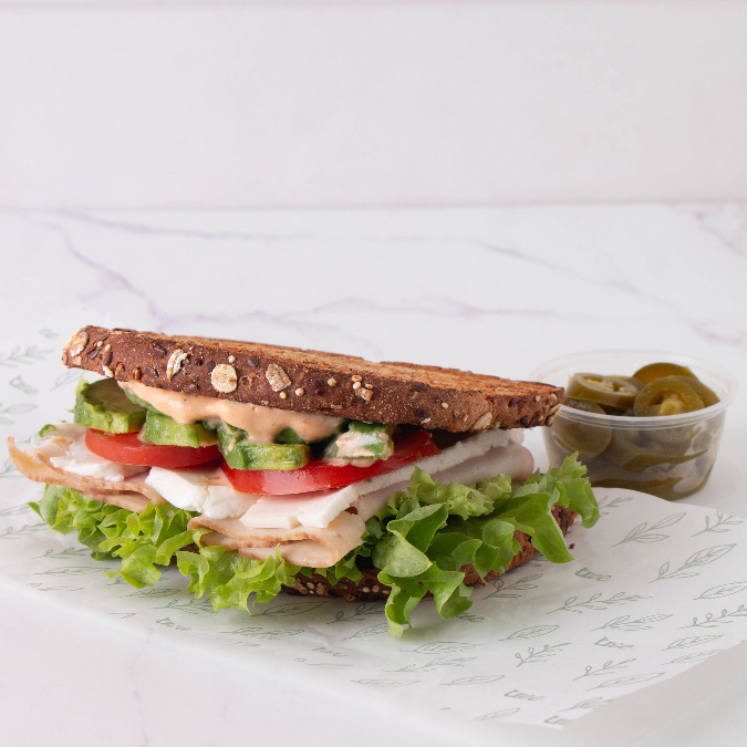 Pan orgánico, pechuga de pavo, lechuga, queso panela, aguacate, tomate y aderezo de la casa.