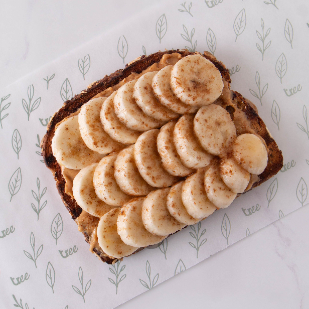 Pan orgánico, plátano, crema de cacahuate, miel de agave y canela.