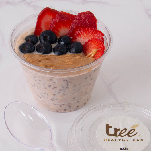 Avena, chía,yogurt griego, leche de almendras,canela y miel de agave. Con fruta de temporada y crema de cacahuate.