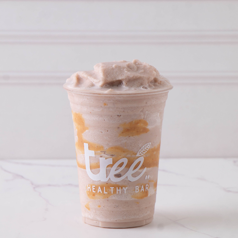 Plátano, crema de cacahuate, cacao nibs, dátil y leche de almendras.