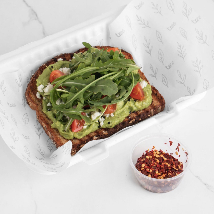 Pan orgánico, aguacate, queso feta, tomate cherry, arúgula y ajonjolí.