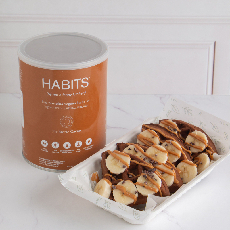 Waffles de avena,cacao y leche de almendra con 15g proteína HABITS sabor cacao. Acompañados con crema de cacahuate, plátano, cacao nibs y miel de agave.