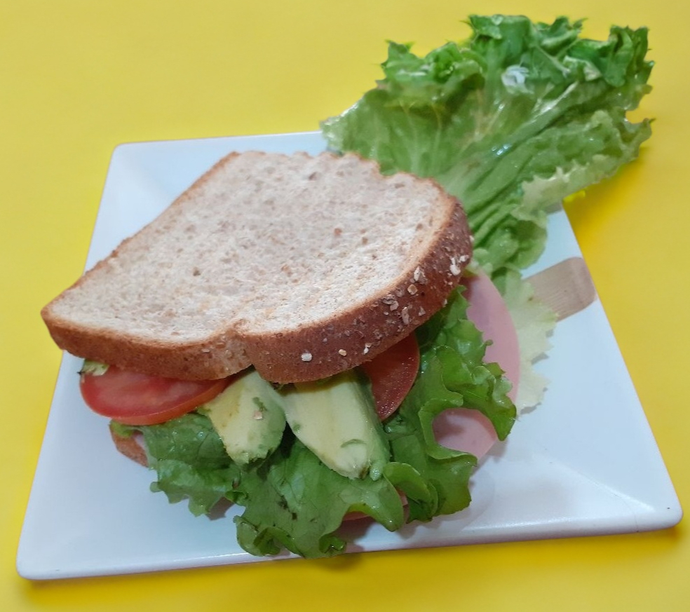 Pan integral de 7 granos, aderezo, queso provolone, jamón de pavo, aguacate, lechuga y tomate.