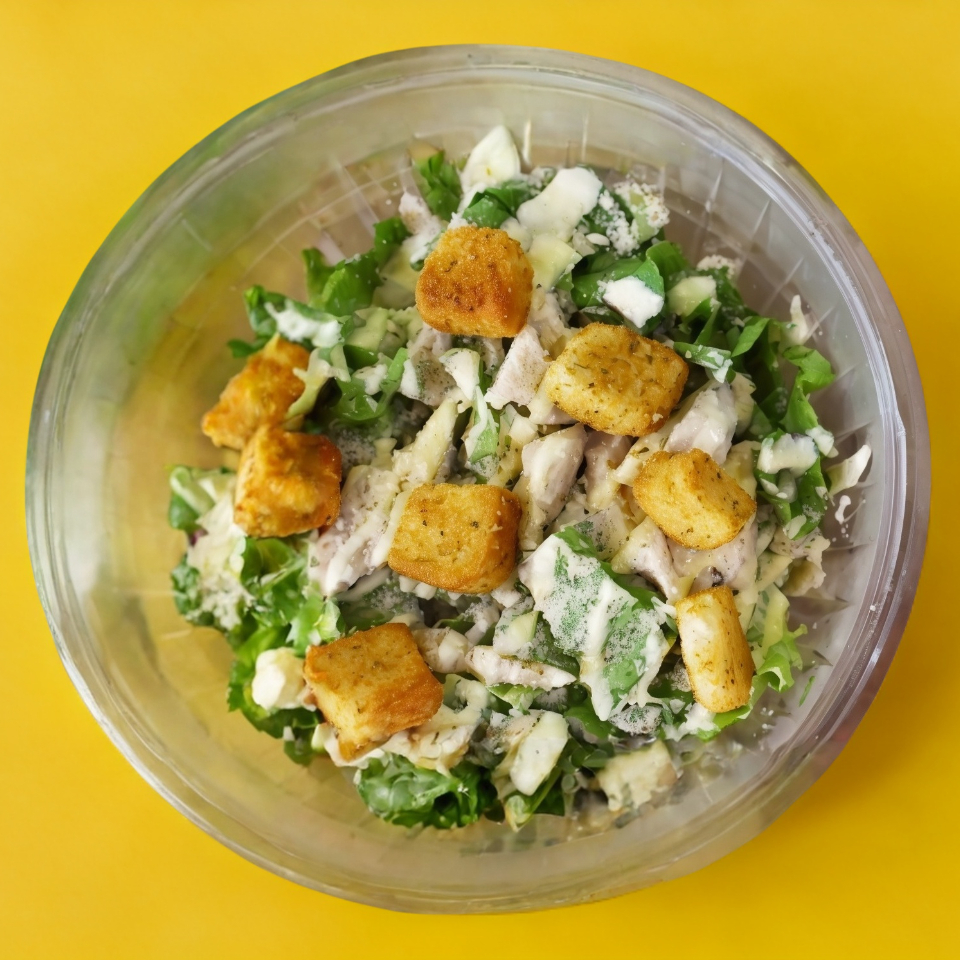 Lechuga italiana, pechuga de pollo a la plancha, queso parmesano. Se añade aparte (si lo incluye) el aderezo césar, crotones y chile en vinagre.