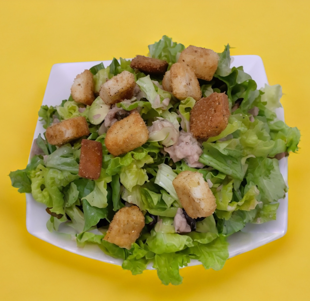 Lechuga italiana, atún, arándano, manzana, aguacate. Se añade aparte (si lo incluye) aderezo italiano, crotones y chile en vinagre.