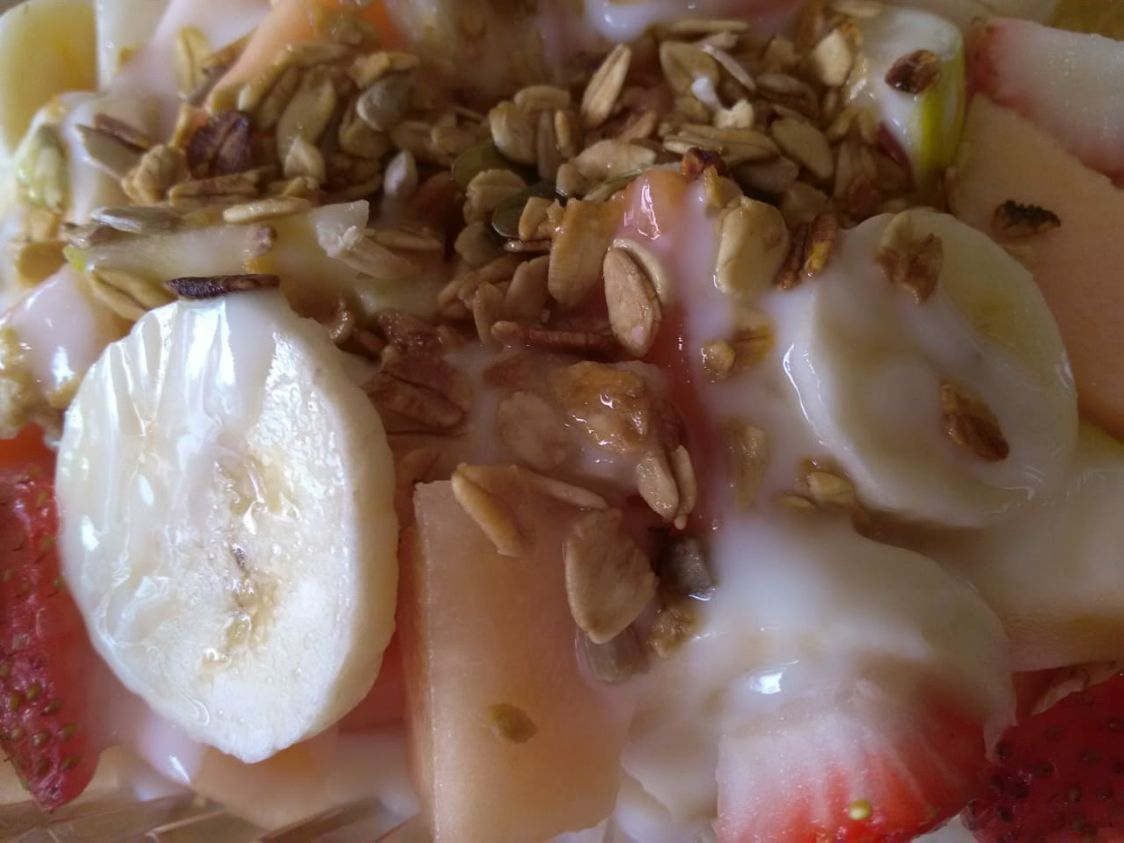 Melón, papaya, manzana, fresa, plátano, granola, yogurt y miel.