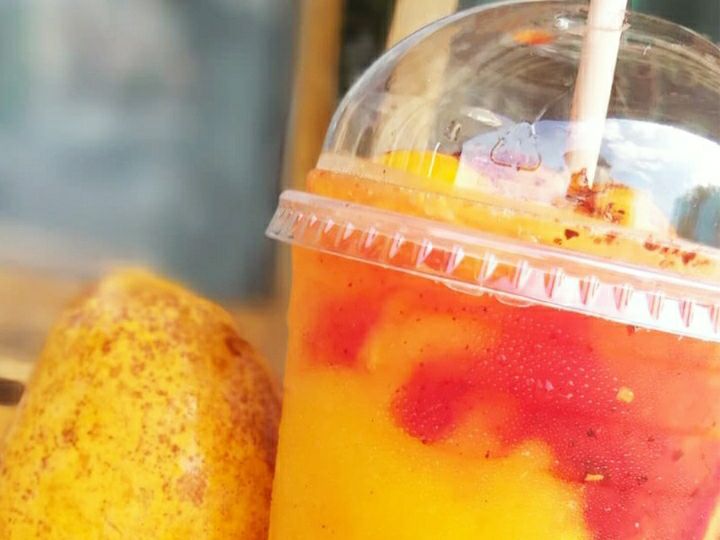 A base de hielo, mango, plátano, piña, plátano, naranja y yogurt, popote.