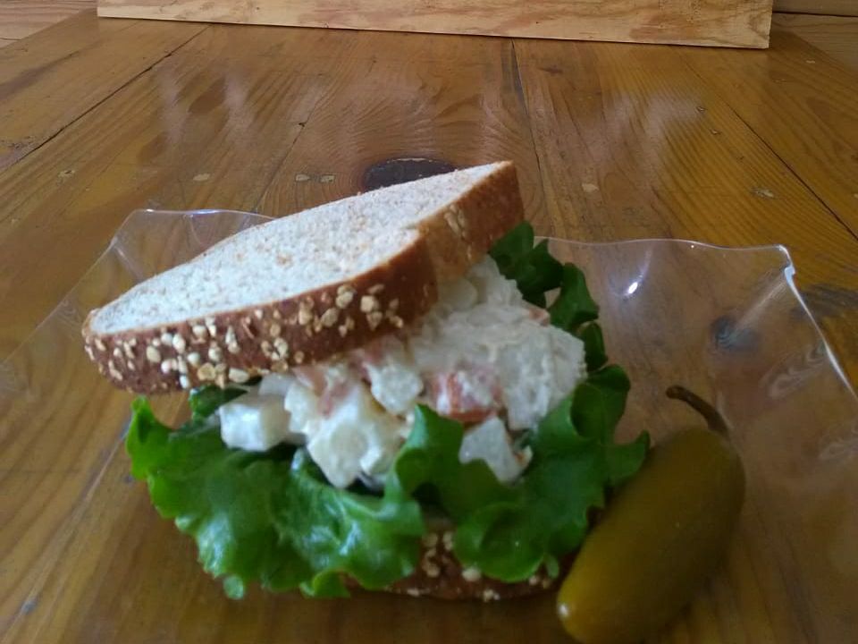 Pan integral de 7 granos, ensalada de pollo, lechuga italiana, chile en vinagre.
