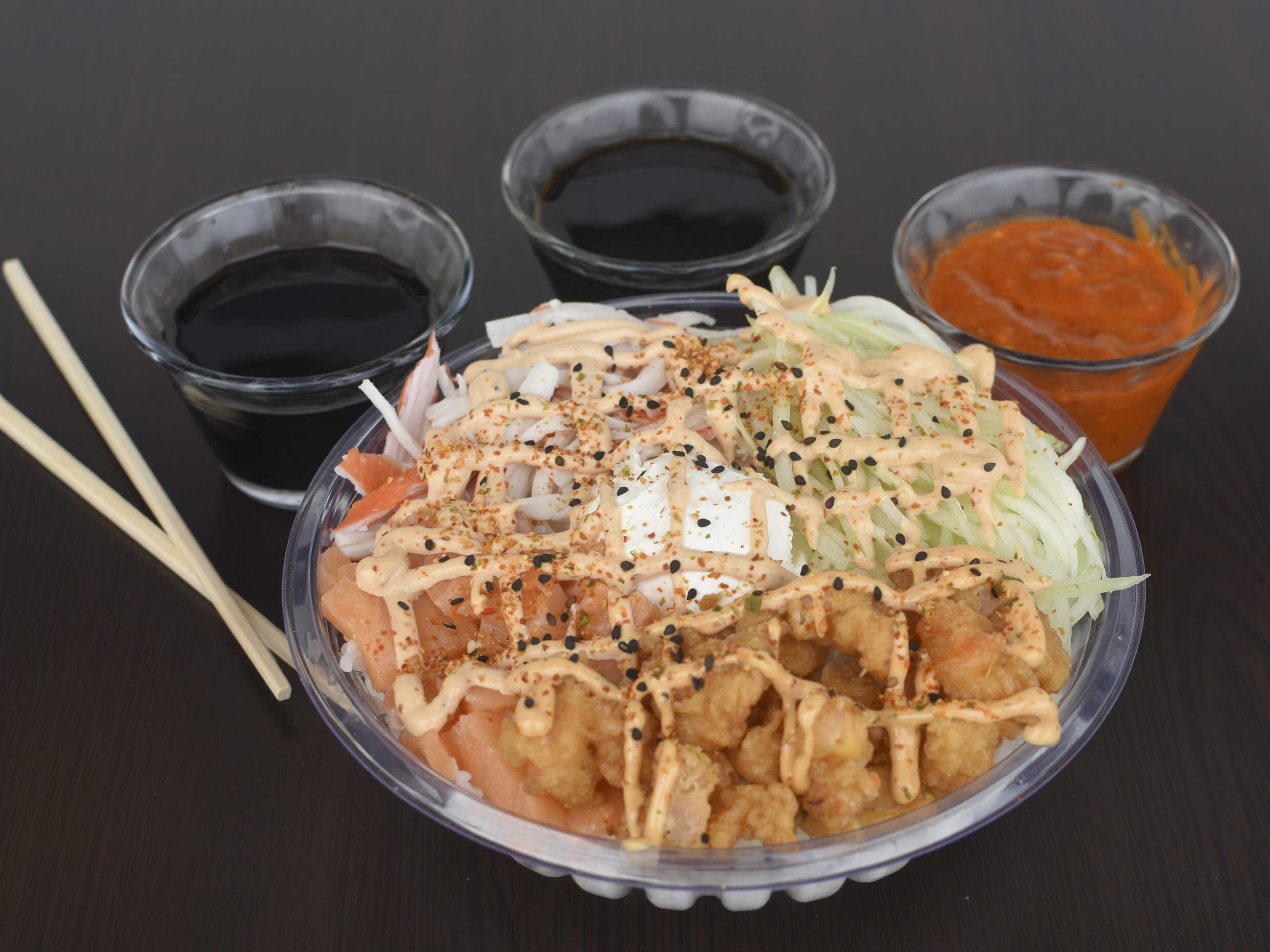 Camarón, queso crema, aguacate, mezcla de camarón y aderezo chipotle por fuera