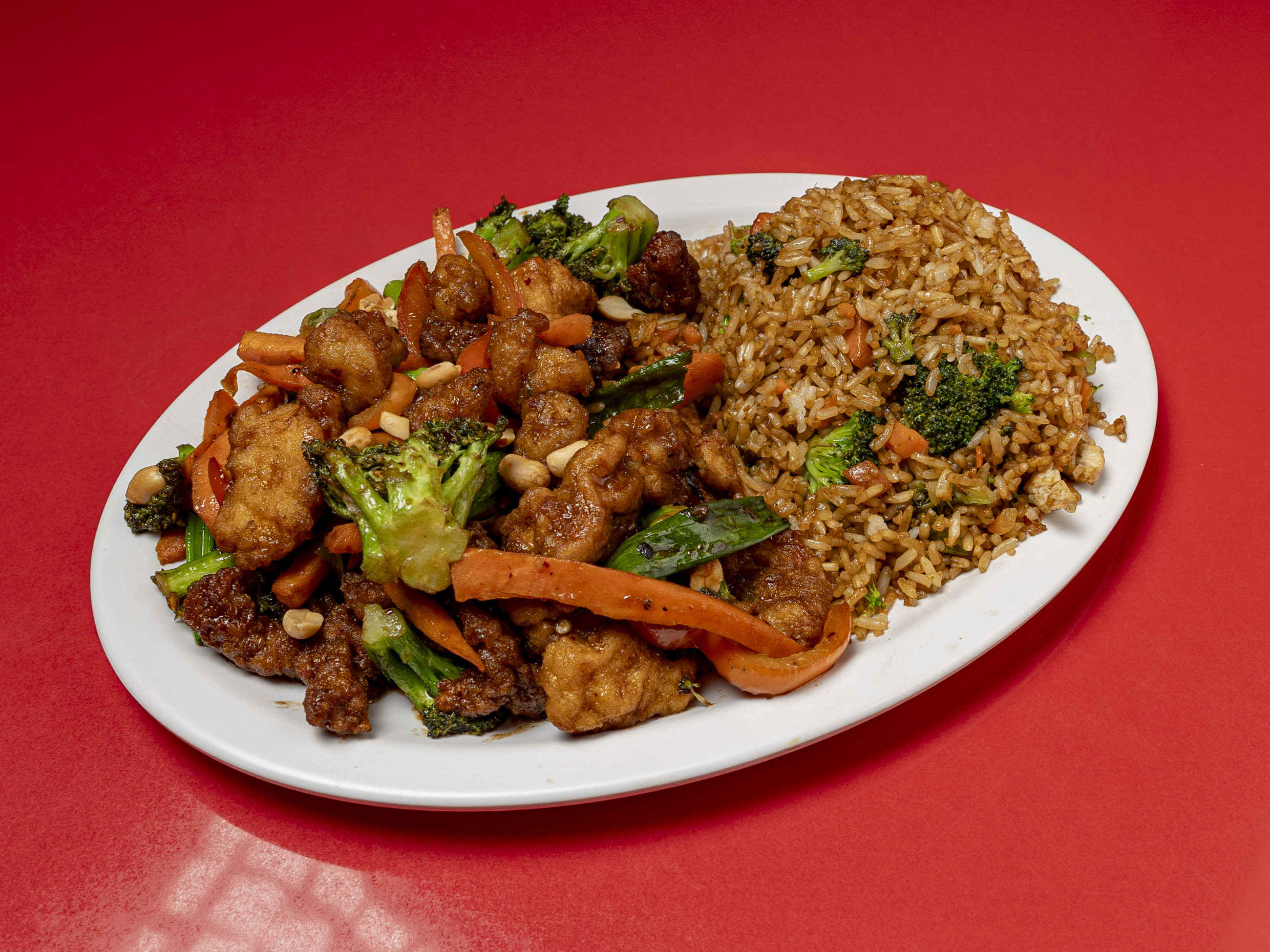 Elige un platillo de pollo de nuestro menú. Incluye pepino y zanahoria rayada y una porción de arroz frito