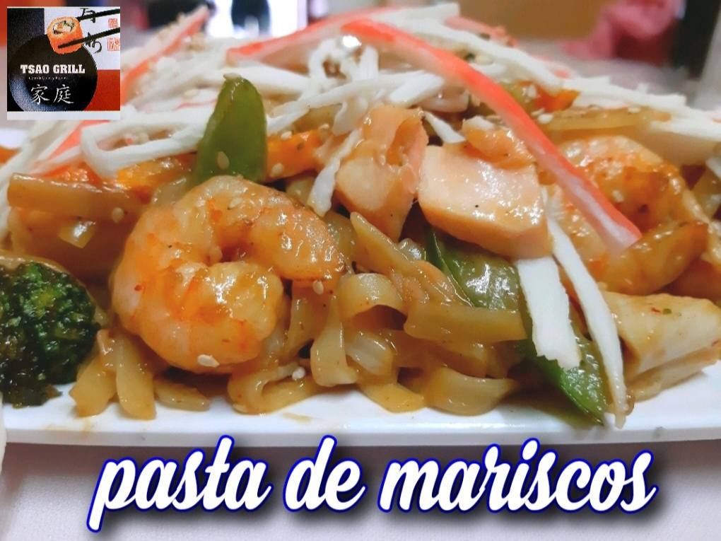 Pasta con pollo, carne y camarón en salsa de ostión, morrón, zanahoria y cebolla cambray.