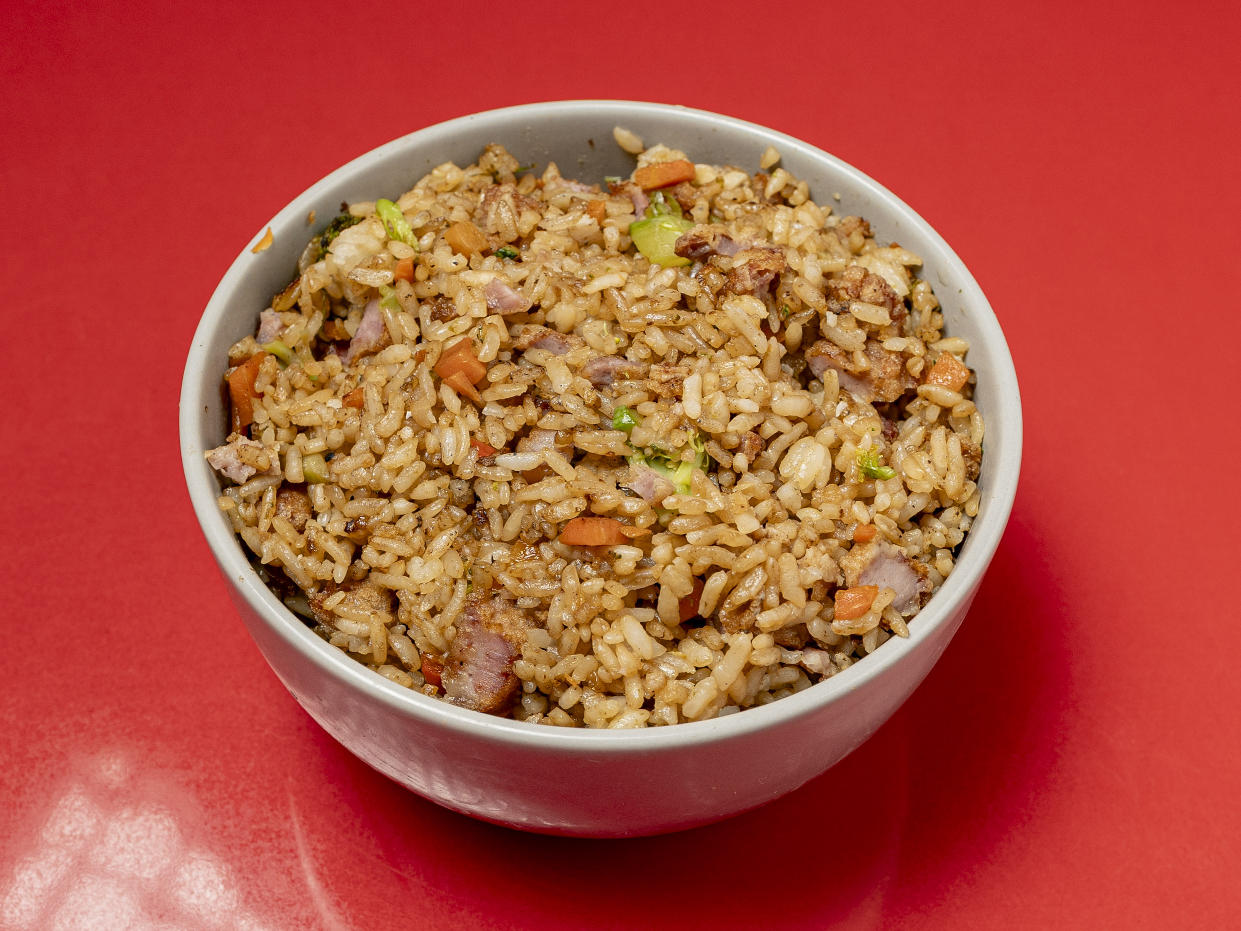 Arroz frito con verduras y carne.