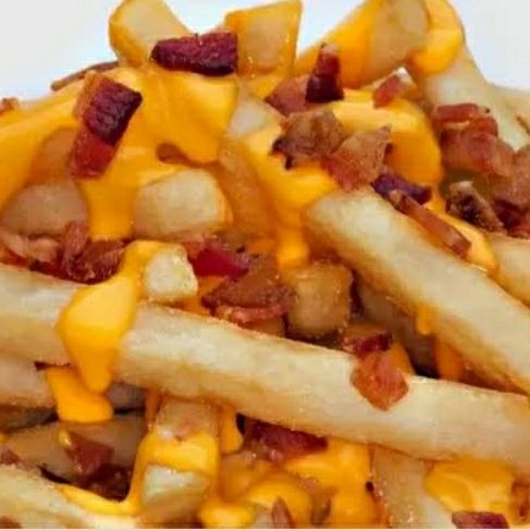 Porción de papas a la francesa con queso amarillo derretido y roseadas con tocino deshidratado.